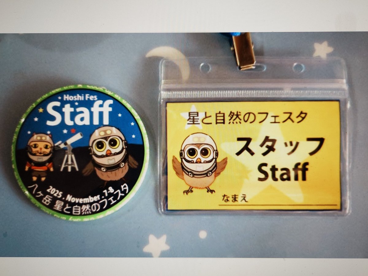 今年の星フェスは、いよいよ来週末に迫って来ました! 開催日は、こんな缶バッチとネームプレートをぶら下げた人を見かけますが、会場運営スタッフですので、気軽に声をかけてくださいね😊 #スターウォッチング #星フェス #星と自然のフェスタ pic.x.com/W3YkPbXumM
