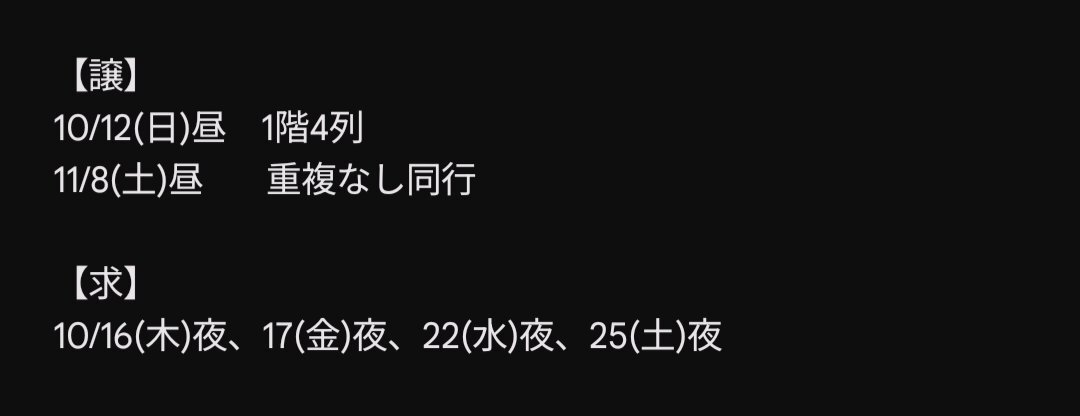 @1 星列車で行こう 交換またはお譲り探しております。 ★譲 【日時】10/15(水) 【座席】1階 7~9列 25~42番 【枚数】 1枚 ★求 【日時】10/26.25 > 土日 ※お譲りは金額ご提示ください お手数ですがご連絡お願いいたします。 #星列車で行こう交換 #星列車で行こう求 #星列車で行こう譲