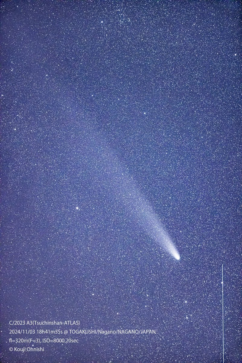 昨年、大彗星となった #紫金山アトラス彗星(C/2023 A3)の11月4日の姿 #大町エネルギー博物館 2025年11月1日~11月15日午前 #大西浩次 #星景写真展 「宇宙と出会う光景を捉える」 地球からの距離と季節の移ろいの変化を 撮影によって追跡した 25枚の記録写真として、その過程を展示 #長野県は宇宙県 pic.x.com/5C1anFc46l x.com/koujiohnishi/s…