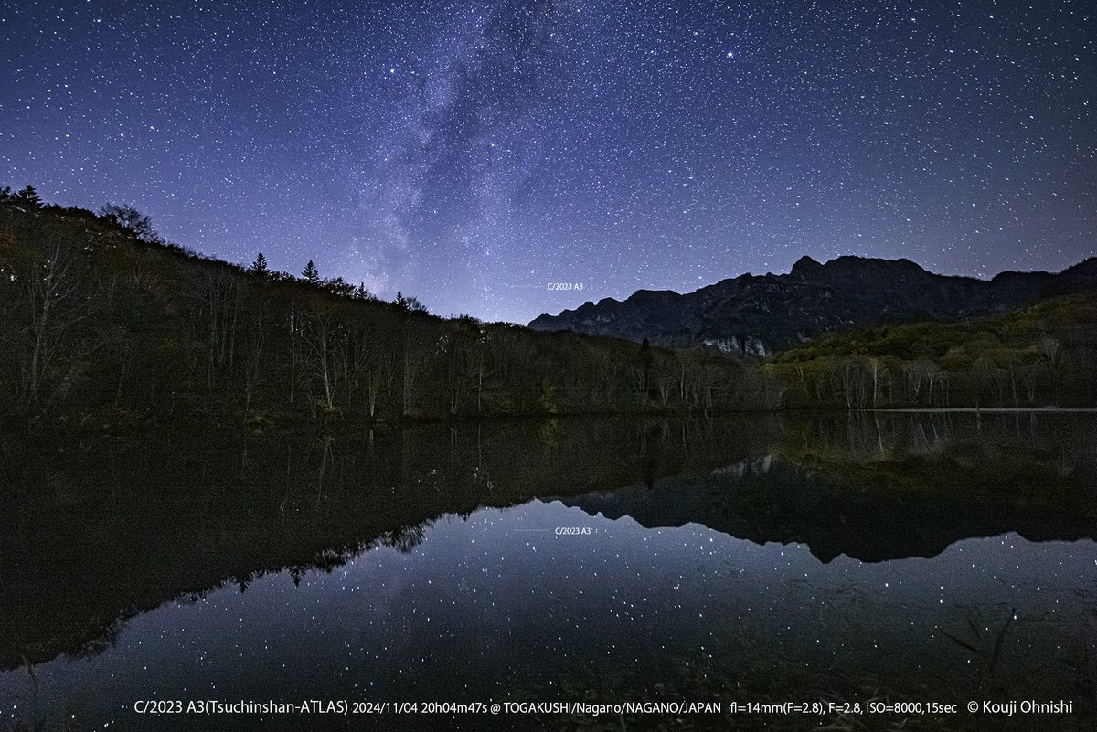 #今日の星景写真 2025年11月4日 「彗星の記憶;紫金山・アトラス彗星」 撮影:2024/11/04 #戸隠 2024年10月、肉眼でも見える大彗星となった #紫金山アトラス彗星 地球からの距離と季節の移ろいにともなう変化を 連続撮影によって追跡した ——11月4日、探してみてほしい C/2023 A3 #長野県は宇宙県