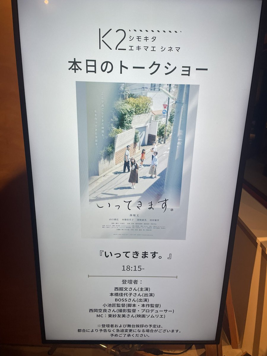 『#いってきます。』 #映画いってきます #シモキタエキマエシネマ K2にて鑑賞。 #小池匠 監督 #西岡空良 プロデューサー #横堀文 さん #山口森広 さん #本橋佳代子 さん #岡崎森馬 さん #伊藤汐梨 さん(主題歌) facebook.com/share/p/17WV1S…