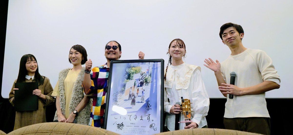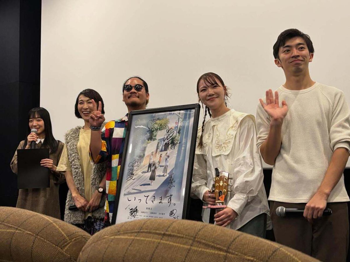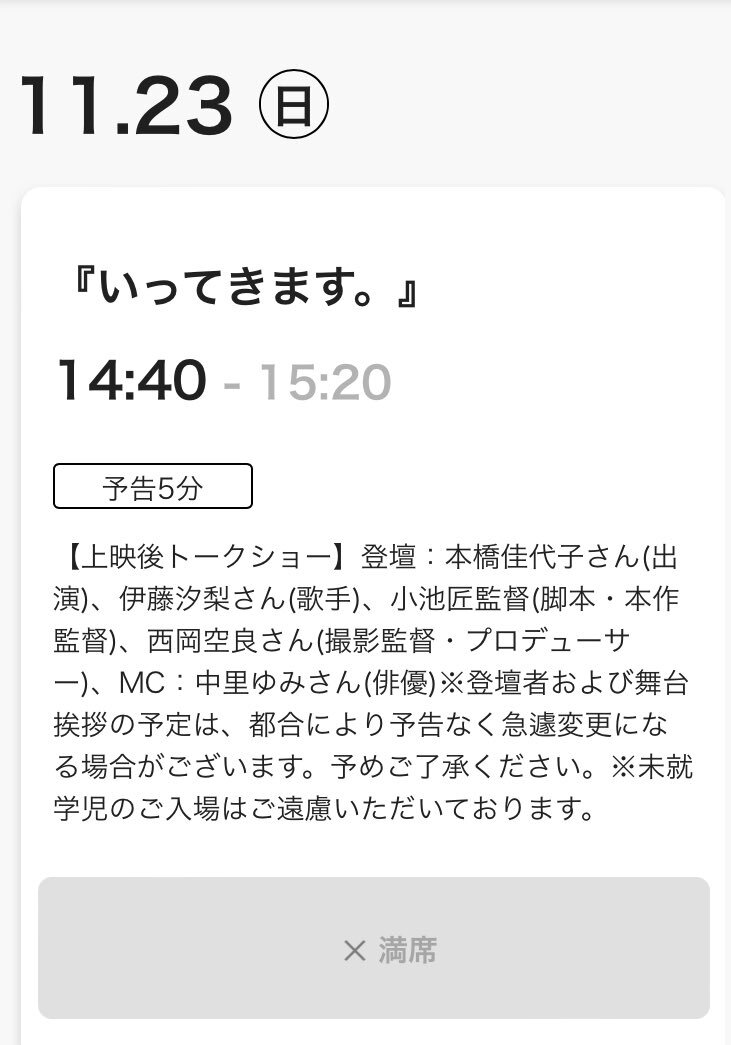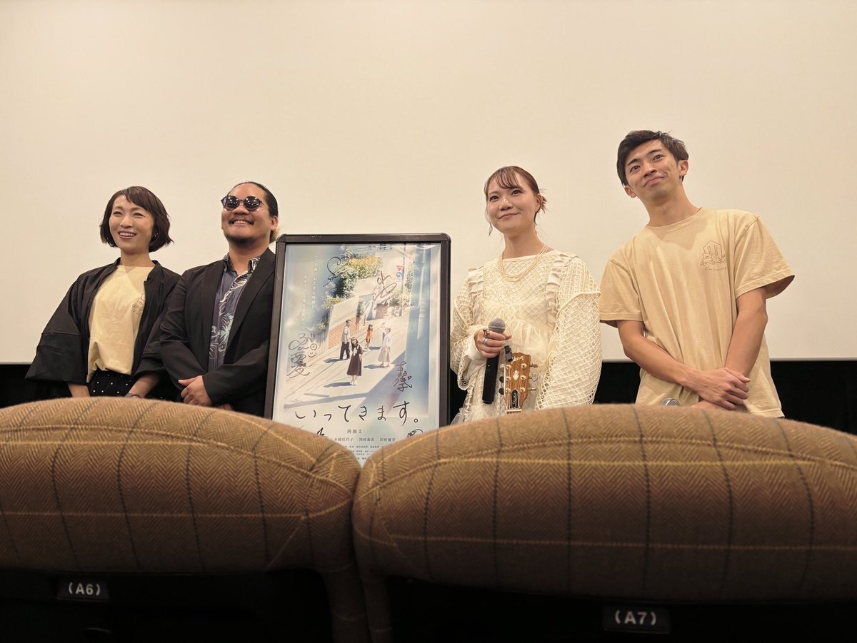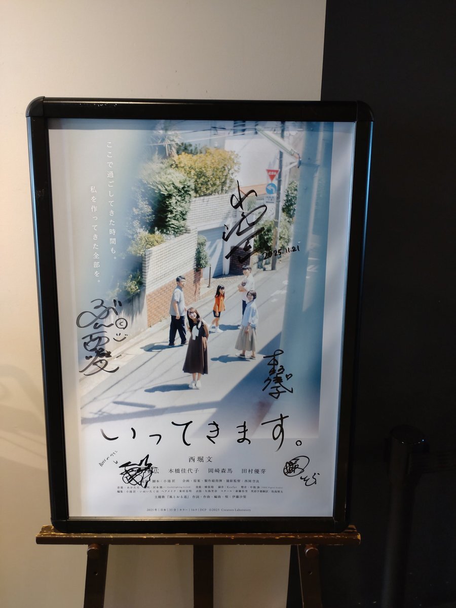 上映後は舞台挨拶。小池匠監督、伊藤汐梨さん、本橋佳代子さん、西岡空良さんが登壇。MCは樋口佑奈さん。トークと伊藤さんのアコースティックライブ。書き下ろしだから溢れる想いがあって。上映中は我慢してた涙が歌声で決壊。あの美しい声には優しい温もりがあった。良き時間。 #いってきます。