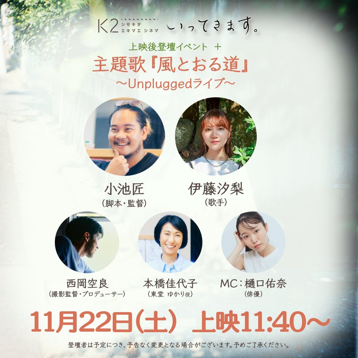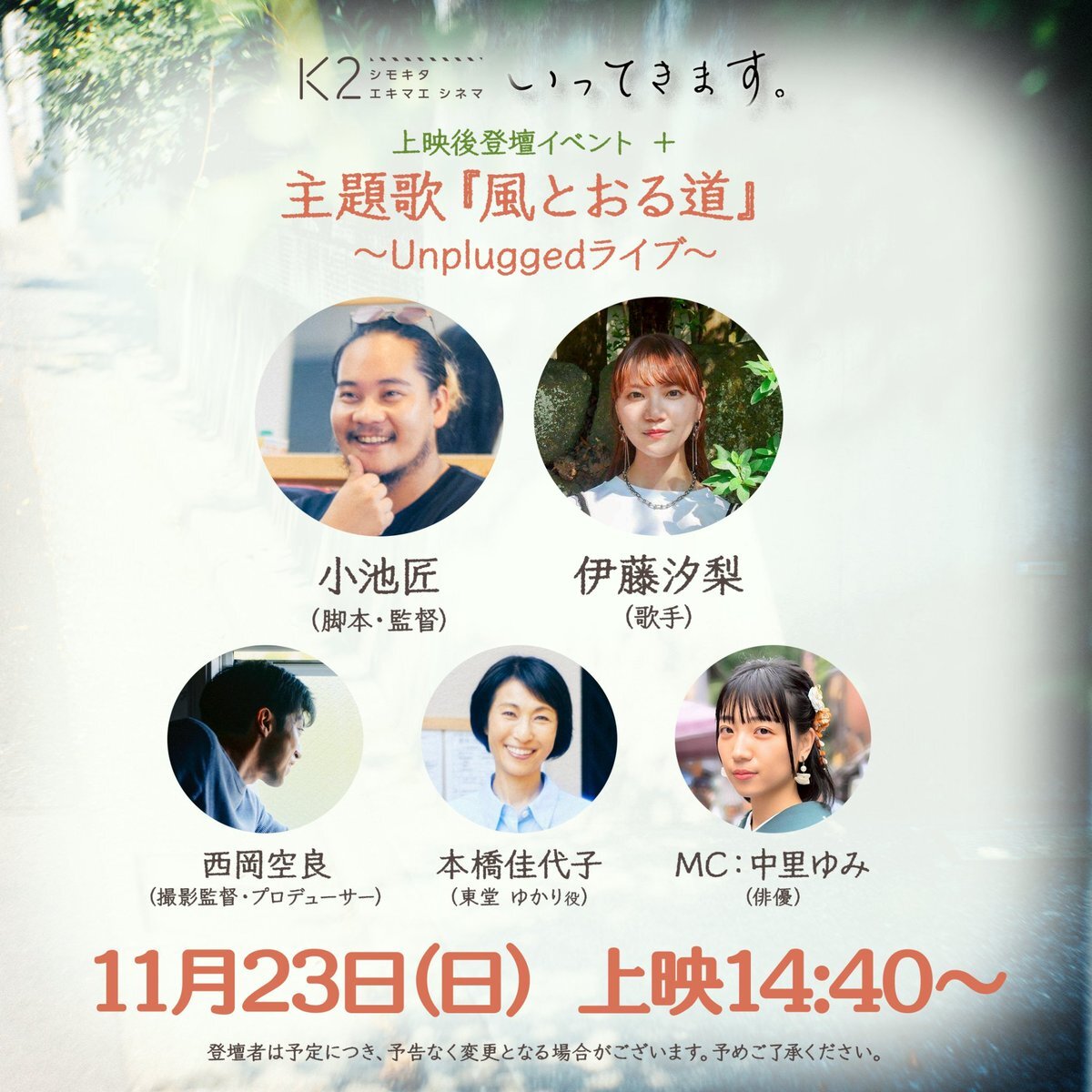 ‼️上映3Days目はこちら‼️   【11月23日(日)回】 - 14:40 START 🎶🎶主題歌『風とおる道』Unplugged LIVE付き🎵🎵   *🛖GUEST🛖* 🏠ゆかり役 本橋佳代子 @satokayo1025 🏠シンガーソングライター - 伊藤汐梨 @shioriiito 🏠監督・脚本 小池匠 @koiketa93 🏠プロデュース&カメラマン 西岡空良