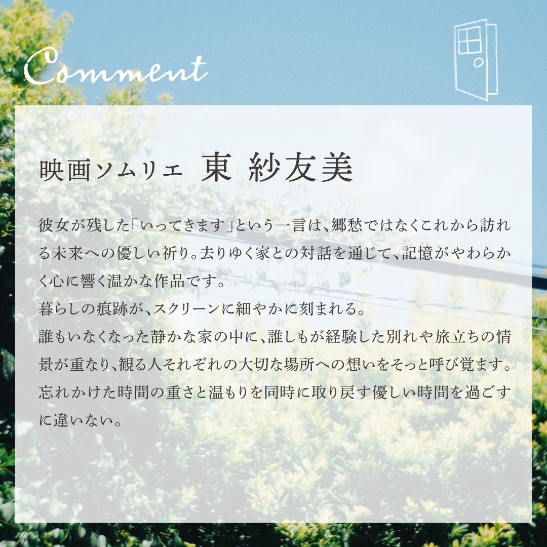 東紗友美さん(@sayumisaaaan )さんからコメントをいただきました! 今作品のテーマとなる家やタイトルに注視した素敵な言葉をありがとうございます!! #映画いってきます。 11月21日(金) 下北沢K2にて劇場公開! 【チケット予約】 k2-cinema.com/event/title/604 x.com/film_im_leavin…