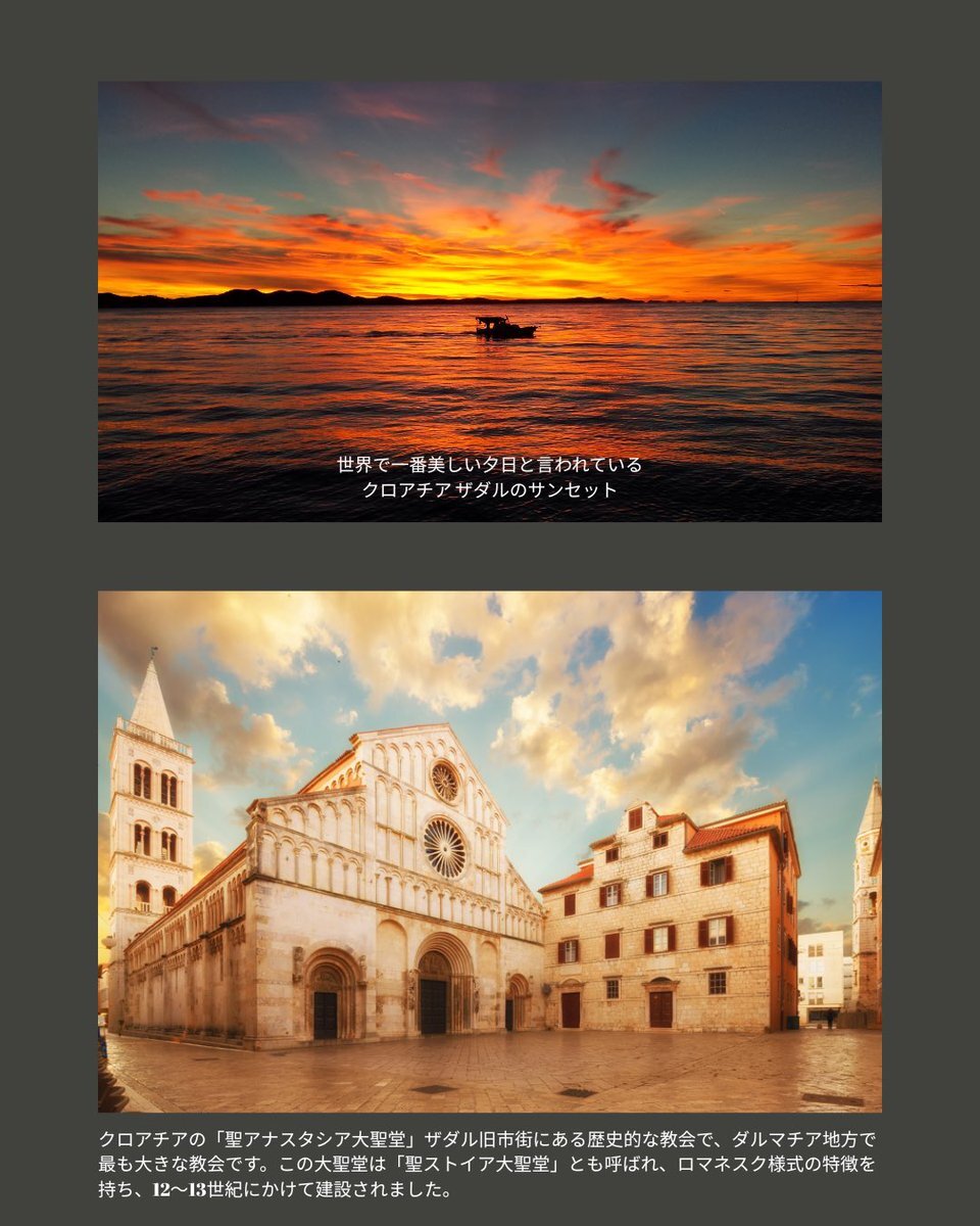 #クロアチア豆知識 |世界一美しい夕陽の街・ザダル 映画監督のヒッチコックも絶賛したという " 世界一の夕陽 " オレンジに染まる海と空のグラデーションは、まるでスクリーンそのもの。 #クロアチア映画祭 #ザダルの夕陽 #映画のような瞬間 #聖アナスタシア大聖堂 #ザダル旧市街 #ヒッチコック pic.x.com/ilsMK3nCcu
