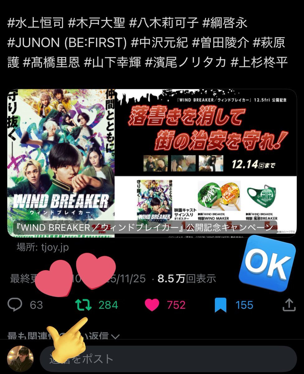 返信先:@tjoy_cp素敵な企画ありがとうございます❕ 情報解禁されてからずっと楽しみにしていたので公開が近づいていてとてもワクワクしてます✨ 主演の水上恒司くん演じる桜が防風鈴メンバーと出会い、街を守り抜く姿を早く大きなスクリーンで見たいです😭 この冬は #映画ウィンブレ 1色に染めます🎐💚 pic.x.com/BmTqBAWfLT
