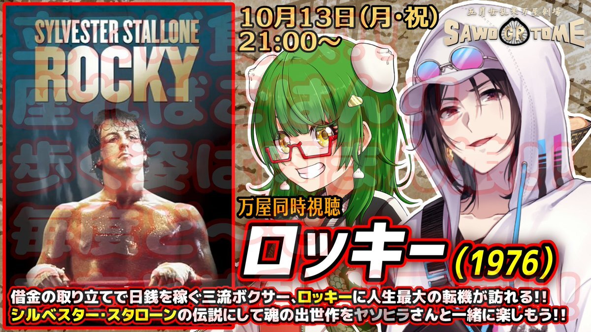 【コラボ告知】 10/13(月・祝) 21:00~ 万屋同時視聴📽️ クラシック映画特集の二本目はスポーツの日に開催‼️ ヤソヒラさんをお招きして『ロッキー』を観ます🥊 映画史に残る魂の試合を見守ろう😆 待機所:youtube.com/live/PJuQKzVow… #同時視聴 #映画好きな人と繋がりたい pic.x.com/CF3Dh8ci3k