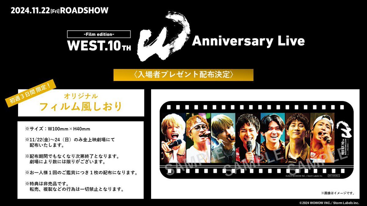 『WEST. 10th Anniversary Live "W" -Film edition-』 / 🚨初週3日間限定🚨 入場者プレゼント配布決定!!!!!!! \ 11/22(金)〜24(日)の3日間 【#オリジナルフィルム風しおり】 を全国の上映劇場でプレゼント🎞️ ▼詳細はこちら news.wowow.co.jp/2014.html #映画版WESTꓸ🌈 @wowowfilms @Storm_FILM_ pic.x.com/cYSOZSJ5ls