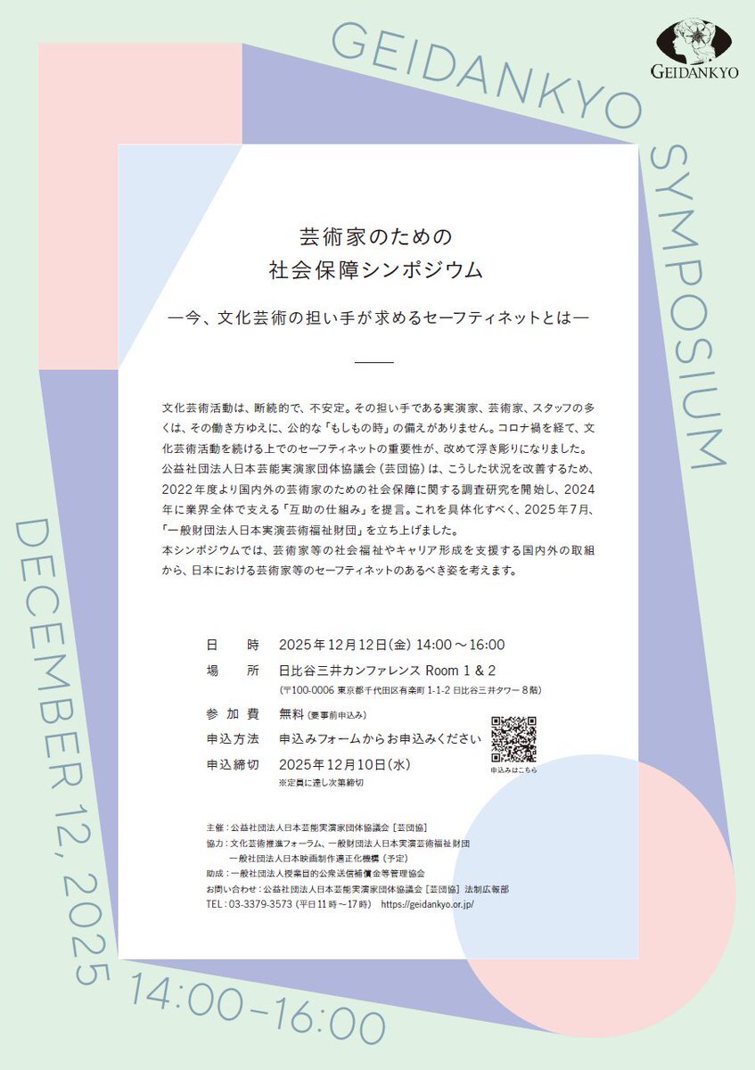 ◤芸術家のための社会保障シンポジウム◢ 開催! 芸術家の社会福祉やキャリア形成を支援する国内外の取組から、日本における芸術家等のセーフティネットのあり方を考えます geidankyo.or.jp/archives/5362 📅2025年12月12日(金)14:00-16:00 🏢ミッドタウン日比谷 💰無料 #劇団四季 #谷桃子バレエ団 #映画監督 pic.x.com/J5BTJNxLlU