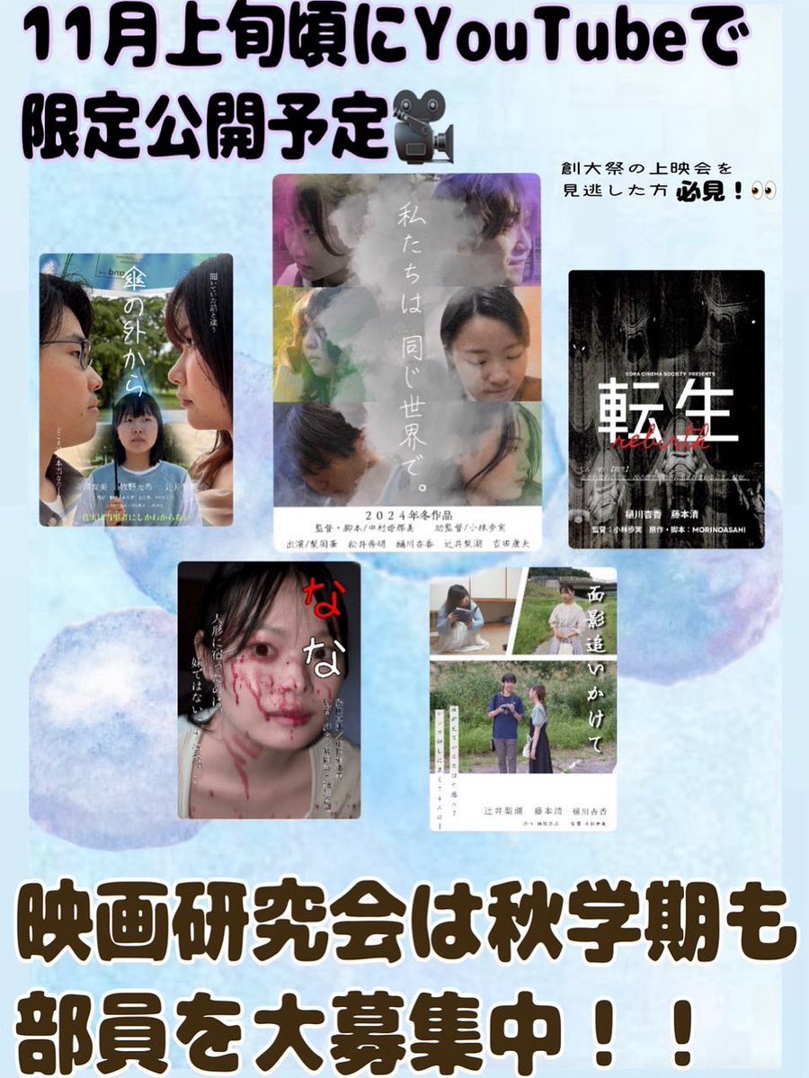 こんばんは!映画研究会です! 創大祭で上映した作品が11月上旬頃にYouTubeで限定公開することになりました!! 映画研究会のInstagramもぜひチェックしてください👀✨ #映画研究会 #創価大 #創価大学 #創価大学映画研究会 pic.x.com/kzjJTtc9EO