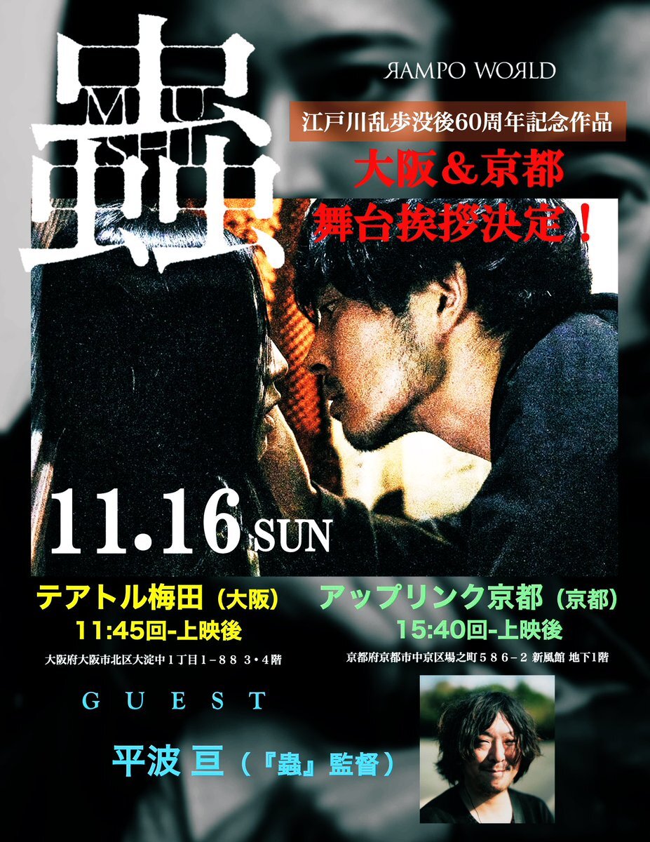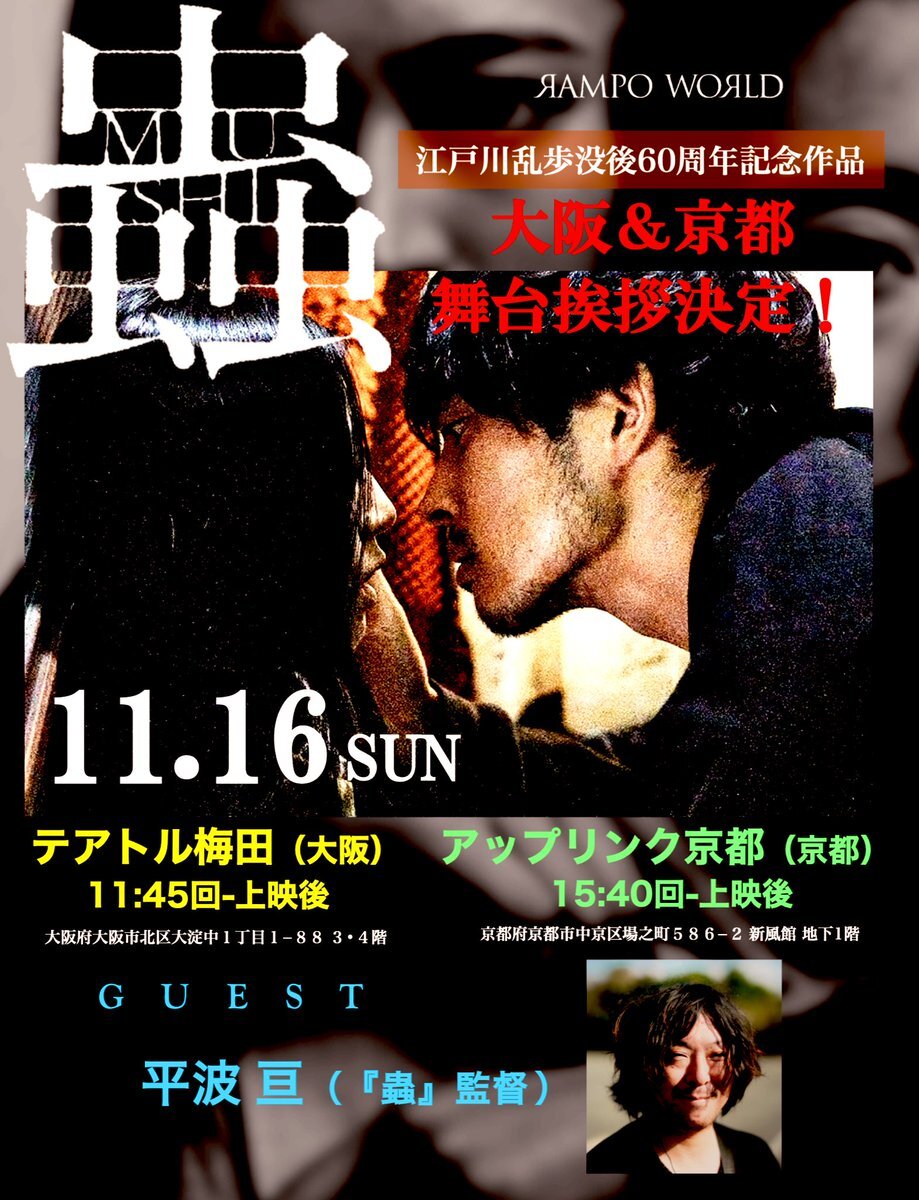 本日水曜日サービスデー 関西の2館で上映中🐛 🐞テアトル梅田さん 🐝アップリンク京都さん #RAMPOWORLD # #映画蟲 #平埜生成 #江戸川乱歩 mushi-movie.com x.com/kinarichanda/s…