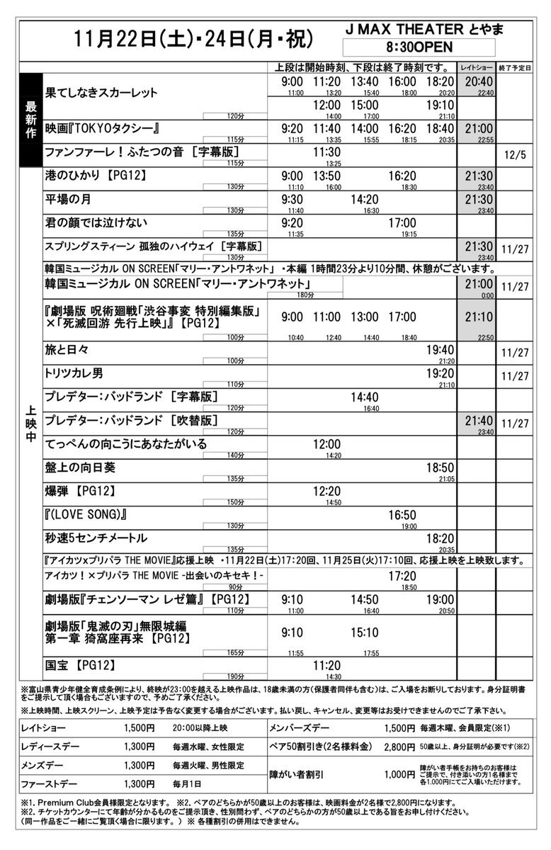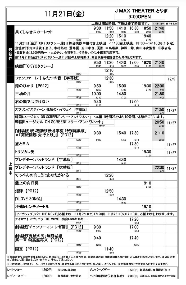 11/22(土)上映スケジュール 11/21(金)〜新作 「#果てしなきスカーレット」 「#映画TOKYOタクシー」 「#ファンファーレふたつの音」2D字幕版 富山県内当劇場のみ上映 #JMAX #JMAXとやま #富山 pic.x.com/t4pdHtv4y7