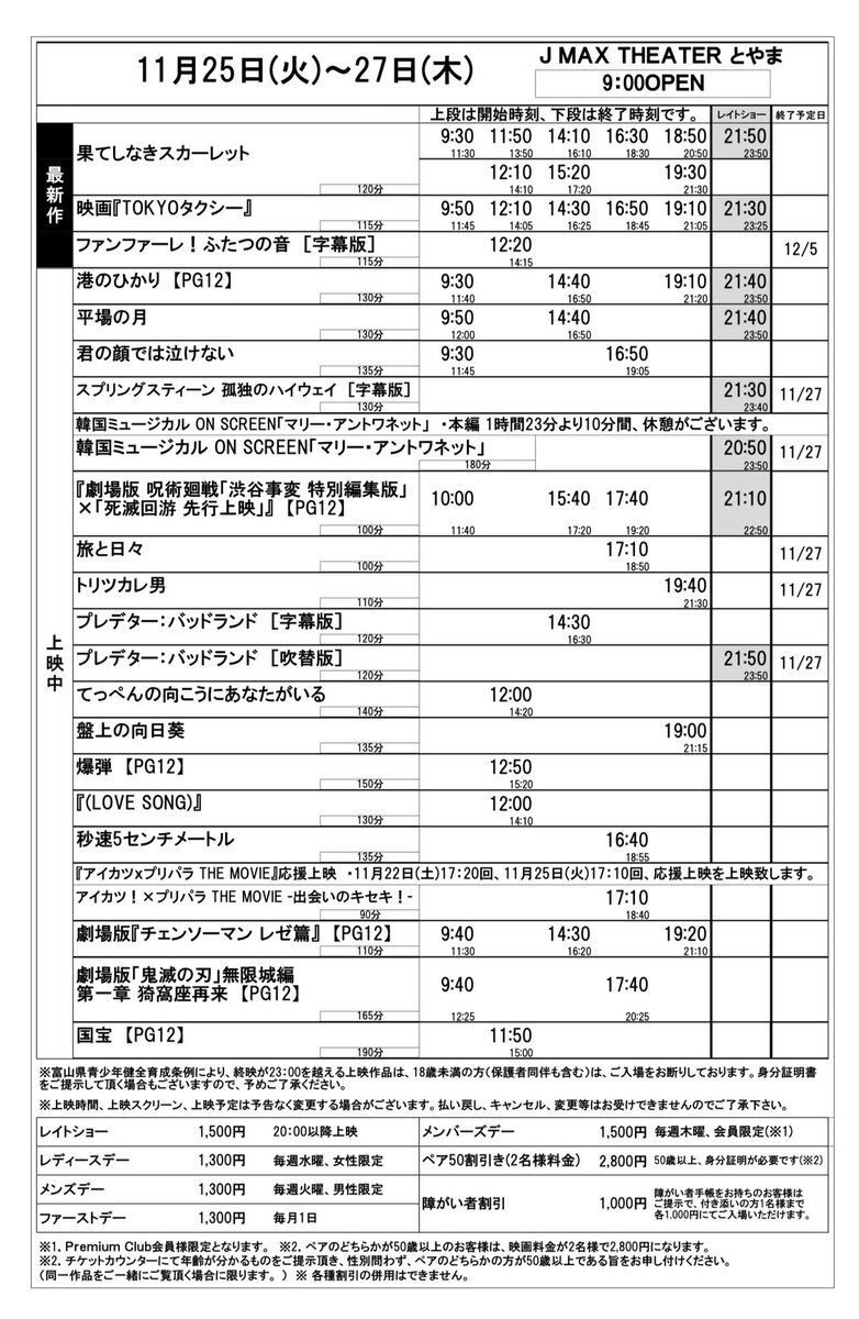 11/25(火)上映スケジュール 11/21(金)〜新作 「#果てしなきスカーレット」 「#映画TOKYOタクシー」 「#ファンファーレふたつの音」2D字幕版 富山県内当劇場のみ上映 #JMAX #JMAXとやま #富山 pic.x.com/7jBq1Xa6Ba