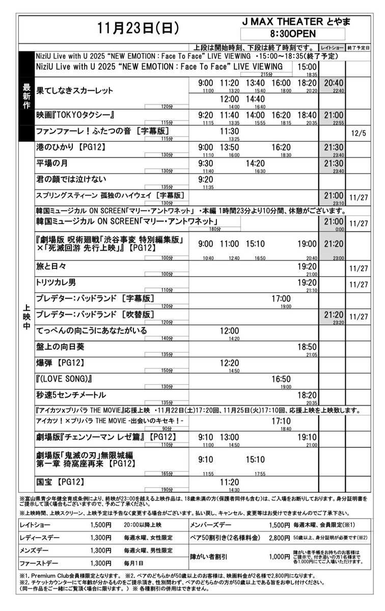 11/23(日)上映スケジュール 11/21(金)〜新作 「#果てしなきスカーレット」 「#映画TOKYOタクシー」 「#ファンファーレふたつの音」2D字幕版 富山県内当劇場のみ上映 #JMAX #JMAXとやま #富山 pic.x.com/OV6uHtJjRX