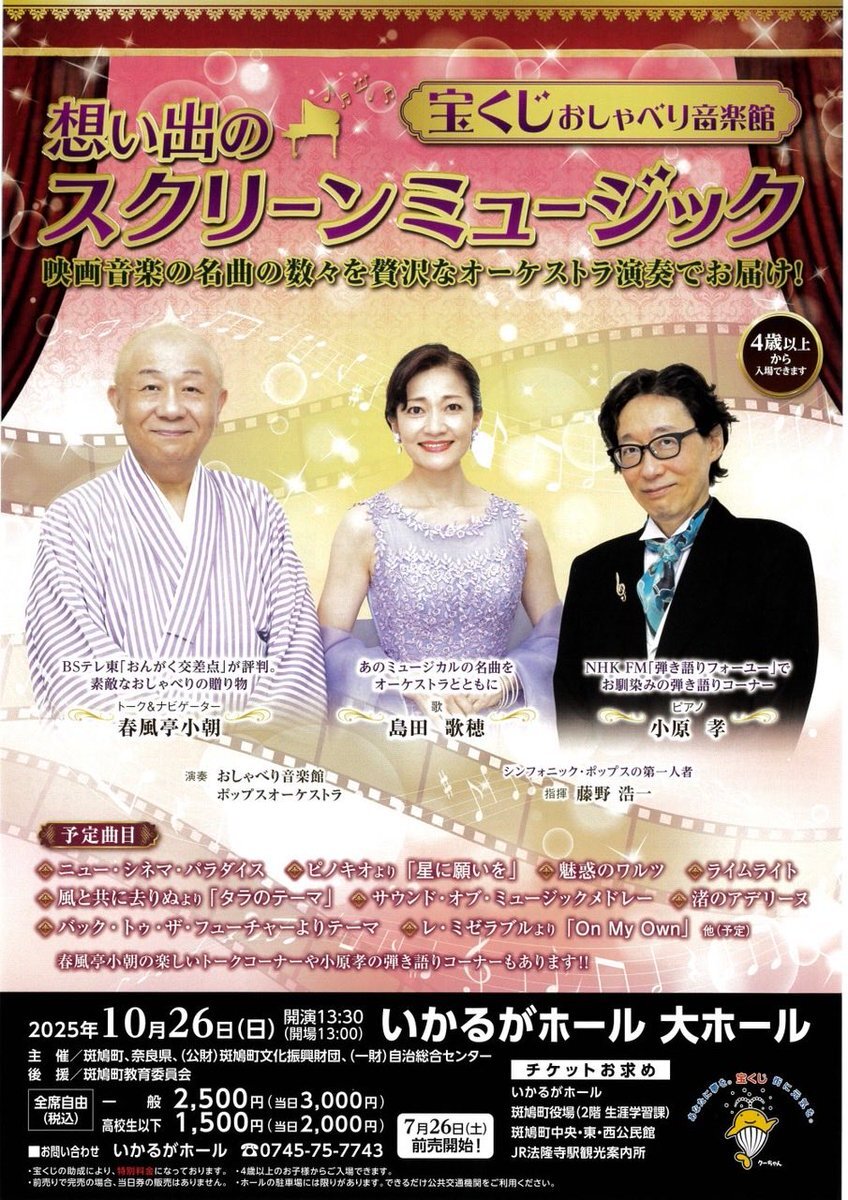 10月26日(日) 13:30開演 「#宝くじおしゃべり音楽館」にて 奈良県斑鳩町の #いかるがホール大ホール に伺います❗️😊 まだお席に余裕があるようです❗️ とっても贅沢でお得なコンサートです😊✌️ お近くの方、是非お越し下さい❗️ お待ちしております💓 #春風亭小朝 #小原孝 #島田歌穂 pic.x.com/JXMAChQLrx