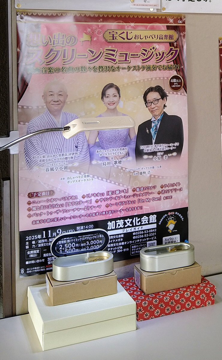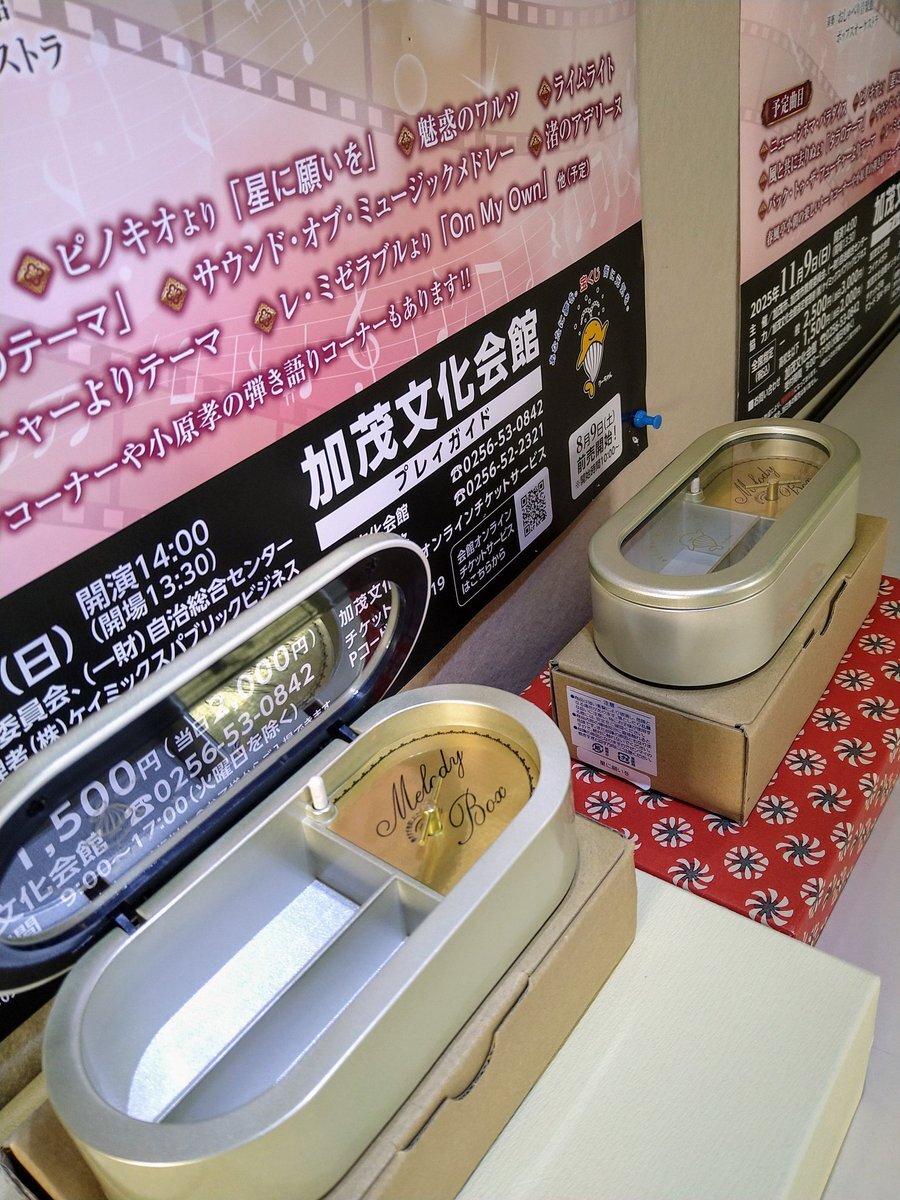 #宝くじおしゃべり音楽館 #新潟県加茂市 に来ております。おしゃべり音楽館の楽しみの一つ抽選会で当たる「特製オルゴール」が飾ってました。本日もお楽しみください。 #春風亭小朝 #小原孝 #島田歌穂 #指揮藤野浩一 #おしゃべり音楽館ポップスオーケストラ pic.x.com/8SeVx7pnHw