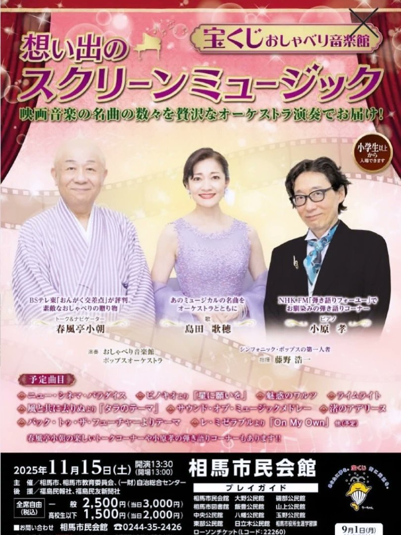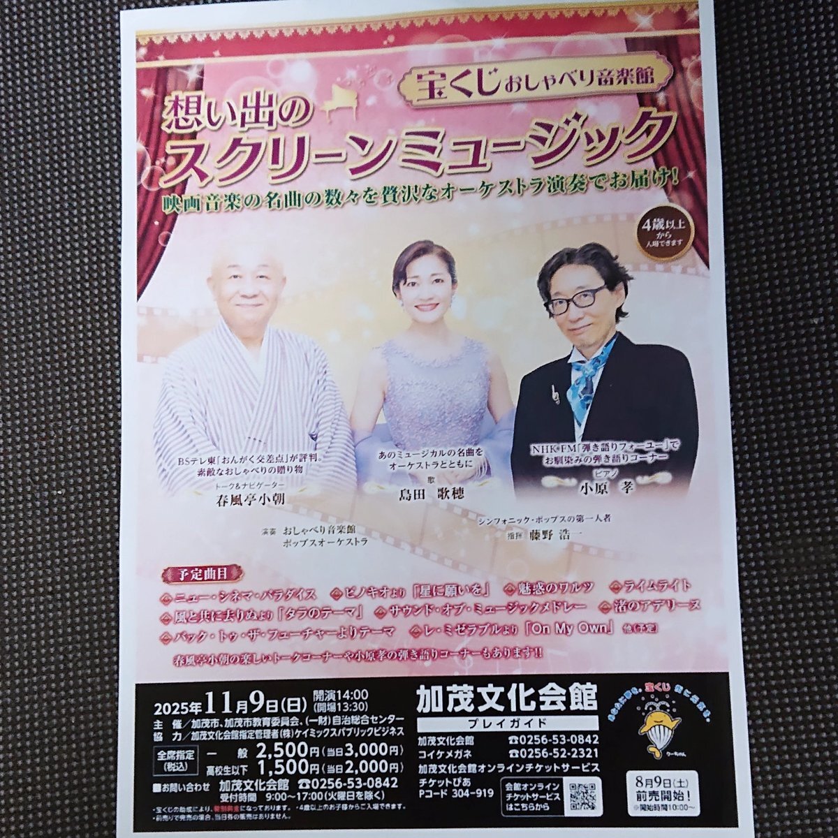 2025年11月9日(日)新潟県加茂市 加茂文化会館 14時開演 #宝くじおしゃべり音楽館〜想い出のスクリーンミュージック #春風亭小朝 #島田歌穂 #小原孝 #藤野浩一指揮おしゃべり音楽館ポップスオーケストラ とても楽しい&お得な演奏会です。 お近くの方は是非🙌 #新潟県加茂市 pic.x.com/HQN8E8dsRo