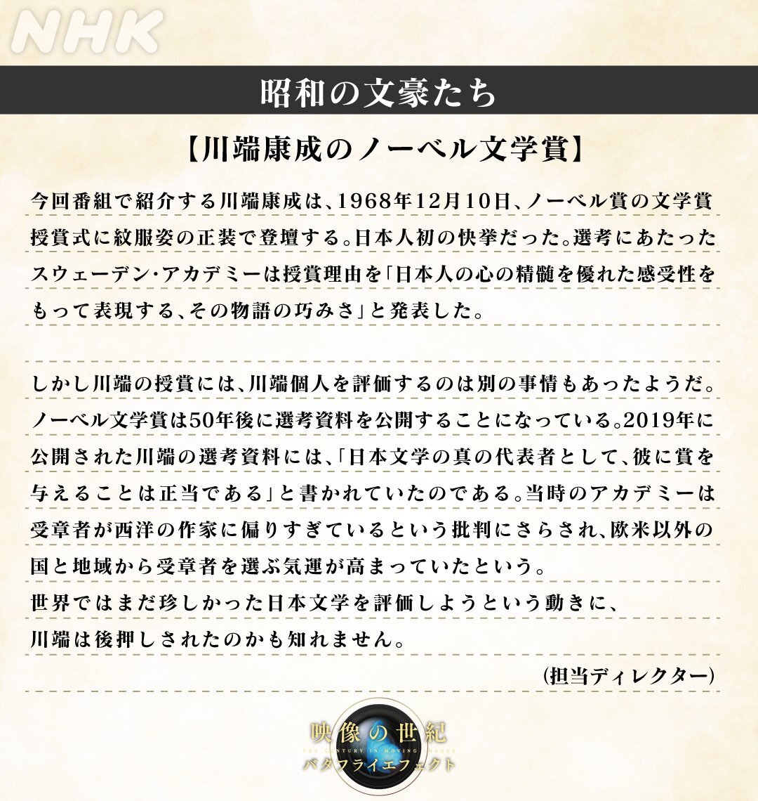放送が始まりました。 「昭和の文豪たち」 担当ディレクターによる見どころです。 ▼配信でも web.nhk/tv/an/butterfl… 今夜の語りは #糸井羊司 アナウンサー。 番組の感想は #映像の世紀 でお待ちしております。 #三島由紀夫 #火野葦平 #永井荷風 #司馬遼太郎 #武者小路実篤 #林芙美子