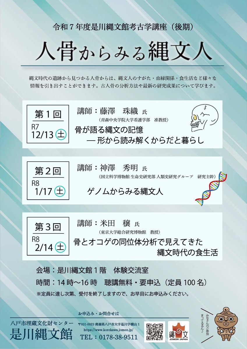 是川縄文館 考古学講座(後期) 🧬『人骨からみる縄文人』🦴 縄文時代の遺跡から見つかる人骨について、最新の分析や研究成果を学ぶ講座だるん♪ 第1回は12月13日(土) ご参加まってるるん♪ 詳しくはHPへ▶︎ korekawa-jomon.jp/events/event/%… #是川縄文館 #講演会 #縄文 pic.x.com/eaQX40XiEe