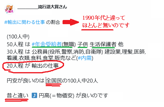 円安が良い は #馬鹿の一つ覚え🤪#時代錯誤 #円安 が良い輸出の仕事は 10人中➔たったの2人程 円安が良い1990年頃と➔ 円高が良い今 その違い ・輸出企業が激減⤵️ ・内需が増えた⤴️ ・年金受給者の増加⤴️(幼児,小中高生,老人国民の50%程が無職) #日経平均 #TOPIX #グロース250 #ダウ #SP500