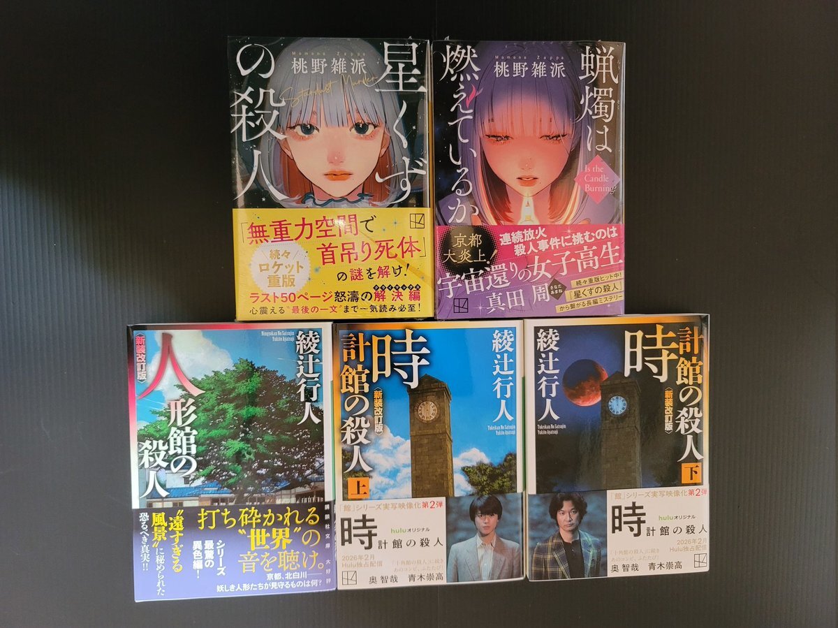 #今日買った・届いた本を紹介する 今日の #自宅図書館 は5冊増。 ずっと気になってた「星くずの殺人」読めないうちに続編まで文庫化しちゃったので、まとめて購入😅 そして、改めて集め始めた館シリーズ。 #星くずの殺人 #蝋燭は燃えているか #桃野雑派 #人形館の殺人 #時計館の殺人 #綾辻行人 pic.x.com/l2WIbPVc0e