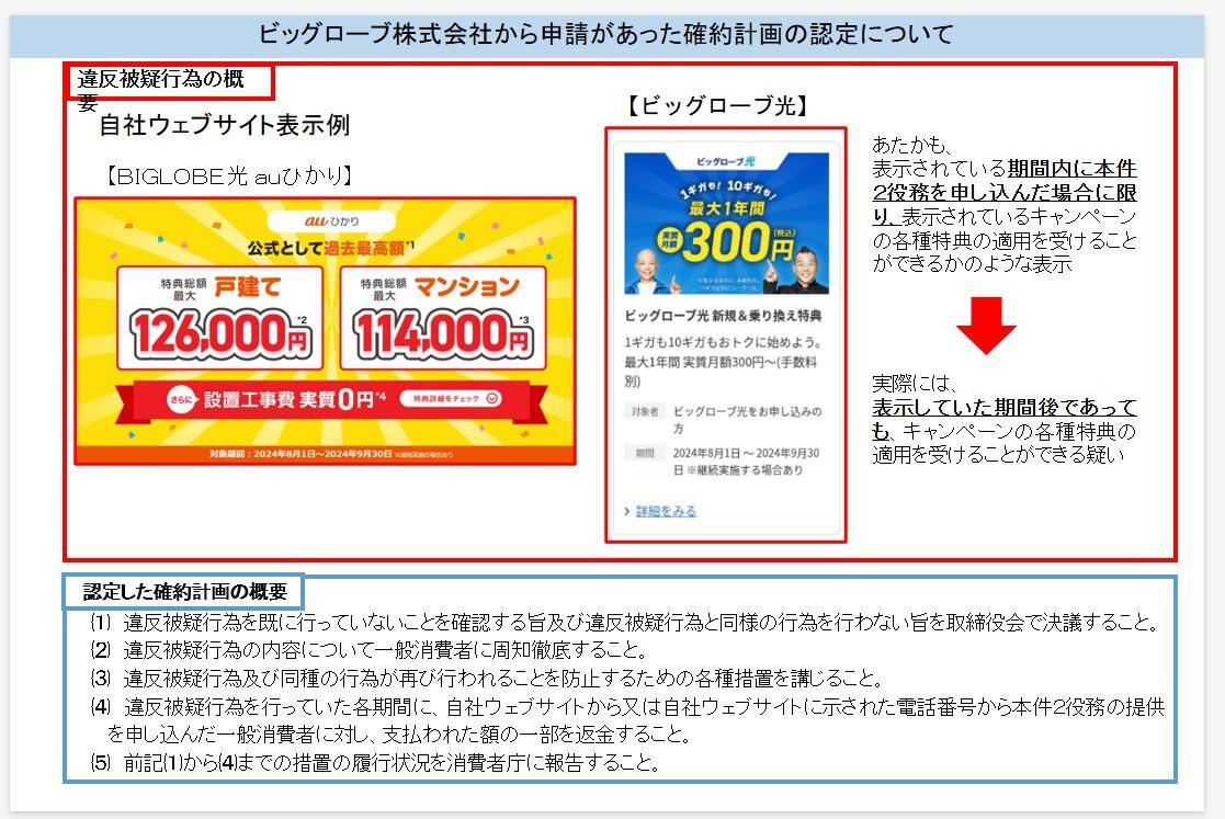 【実務速報】 9/26消費者庁が確約計画を認定(BIGLOBE/景表法5条2号=有利誤認疑い)。「期間限定」表示なのに実際は同種特典が継続。違反の認定ではなく、周知・再発防止・一部返金等の計画を確認。自社のキャンペーン期限表記しましょう! caa.go.jp/notice/assets/… #景品表示法 #確約手続 #有利誤認