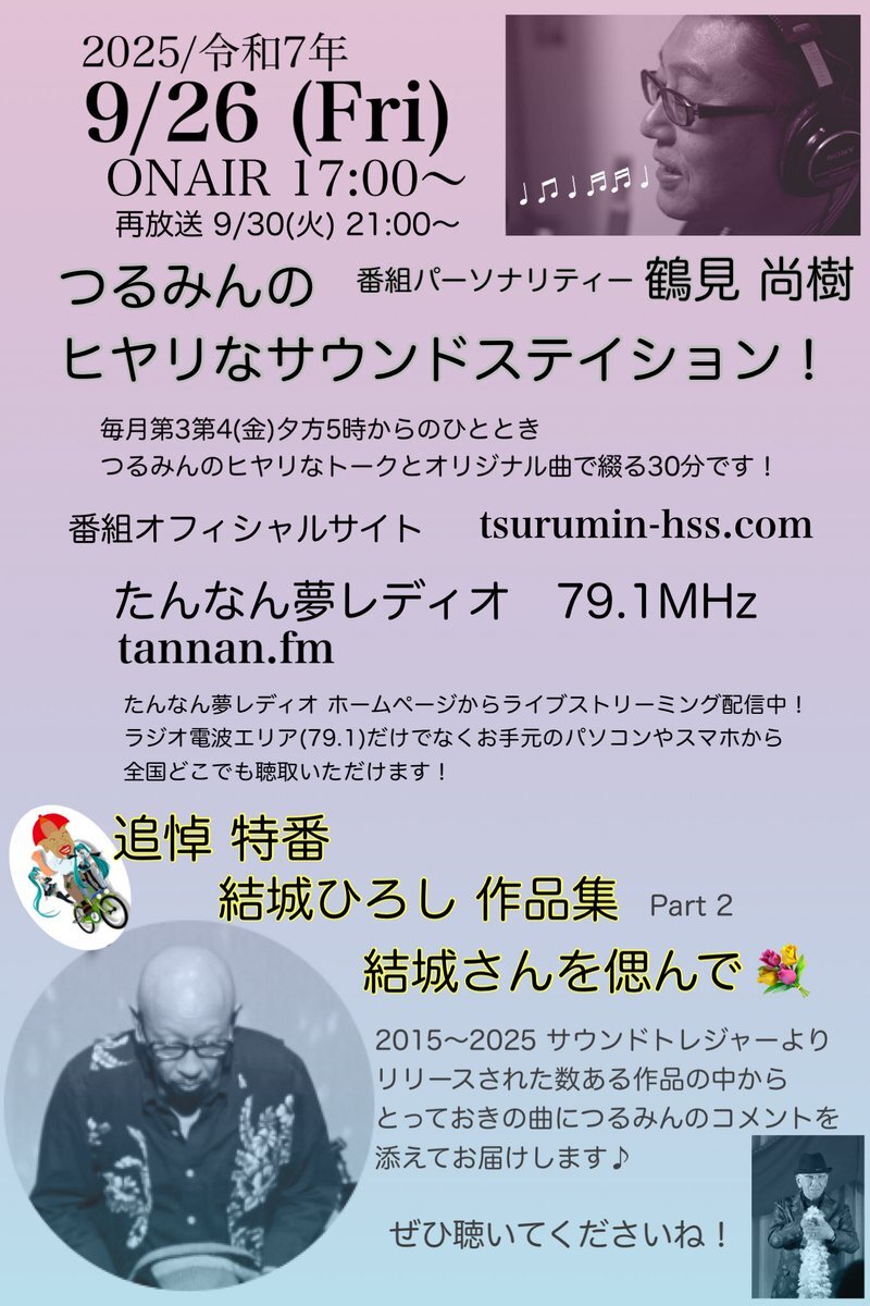2025/9/26(金) 17:00〜 たんなん夢レディオ ライブ配信 tannan.fm エリア外の方はスマホPC タブレット等で。 (再) 9/30(火) 21:00〜 追悼 特番! 結城ひろし 作品集 Part 2 結城さんを偲んで皆さん是非お聴きください! @tsuruminaoki @tannanfm 詳細は tsurumin-hss.com