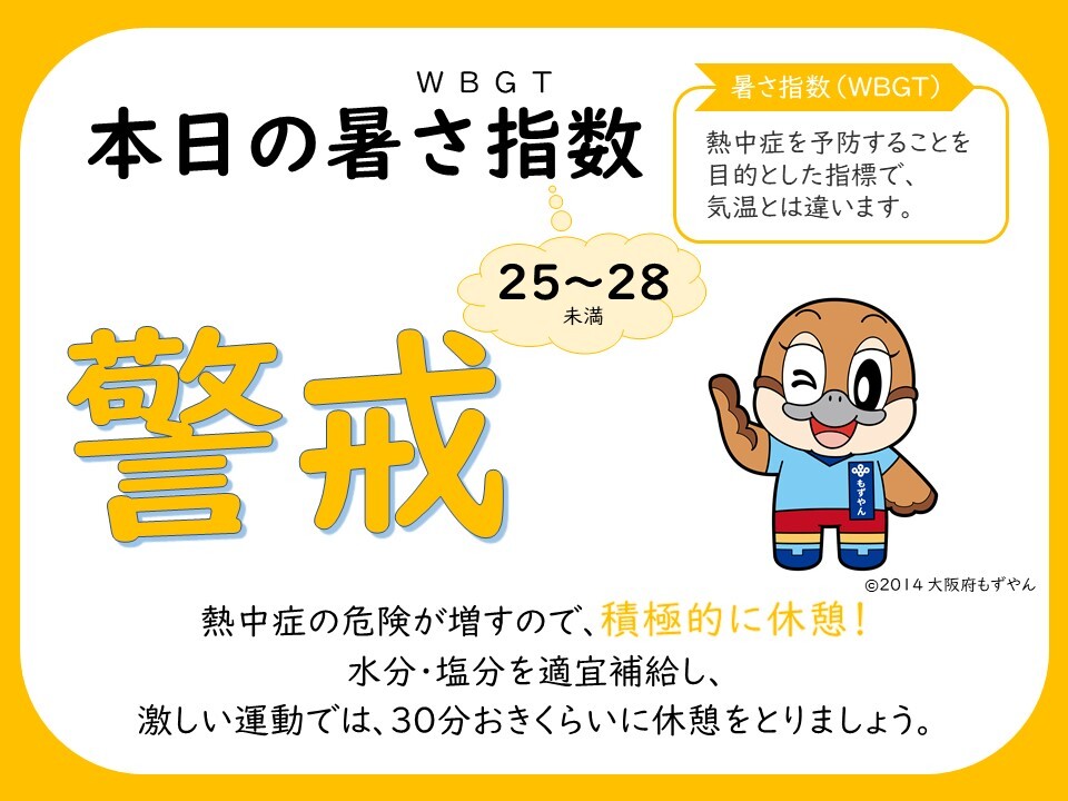 今日(10月14日)の府域の日最高暑さ指数(予測値)は、「27」。「警戒」区分です。(環境省提供) 運動や、たくさん体を動かす作業をする時は、定期的にしっかり休みましょう。 #暑さ指数 #熱中症 #熱中症対策 ◇詳しい暑さ指数の情報はこちら wbgt.env.go.jp/wbgt_data.php?… pic.x.com/oGYDufpY9B