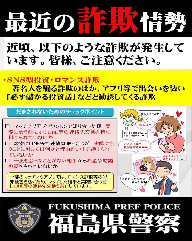 投資・ロマンス詐欺に注意!  近頃、SNS型投資・ロマンス詐欺被害が増加しています。  騙されないためのチェックポイントを確認して、被害に遭わないようご注意願います。(生活安全企画課) #福島県警 #福島県 #警察 #詐欺 #投資 #ロマンス #出会い # #暗号資産 #なりすまし pic.x.com/ZsG8JyKZ4r