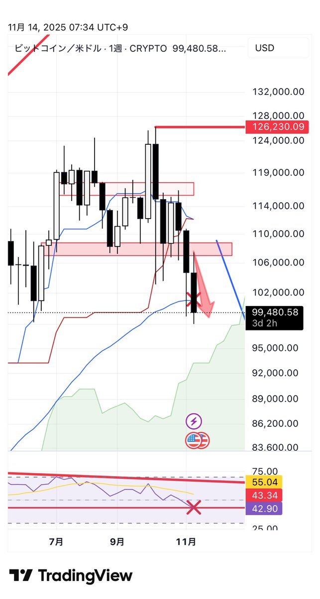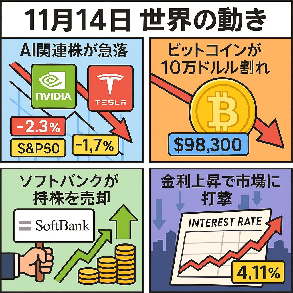 11/14の市場は大荒れ。AI関連株急落でナスダック-2.3%。金利4.11%に上昇し成長株に逆風。BTCも10万ドル割れで98,300ドルへ。ソフトバンクのNvidia売却も衝撃。市場は調整モードへ。 #ビットコイン #暗号資産 #AI株 #米国株 #金利 #11月14日 pic.x.com/kWcmBHOvwU