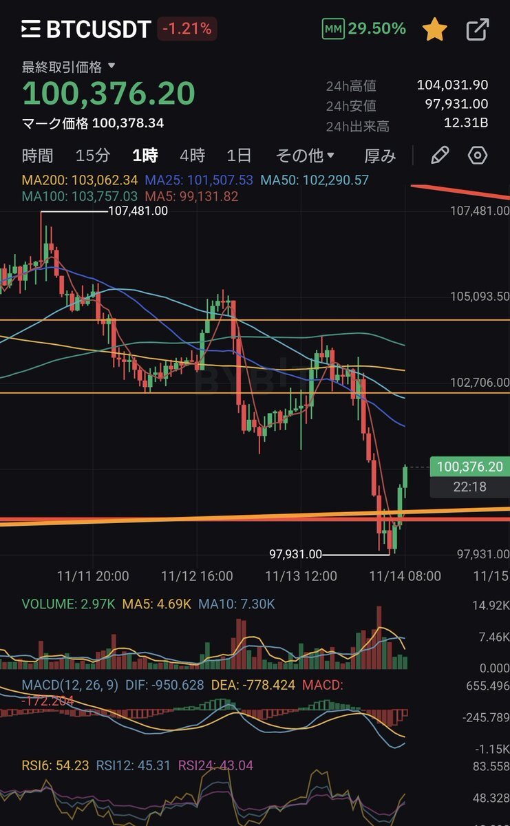 #BTC #Bitcoin 予想通り下げましたね😎 上げたらShortが正解でした🫡 $98500で半利確して残りはまだ持っています🫡 この反発までにまだ下を目指すと思ってましたのでそこは予想外です🤔 今のところLongはまだだと思っております🫡 #ビットコイン #暗号資産 pic.x.com/cPtFre0dwO x.com/tradegym/statu…
