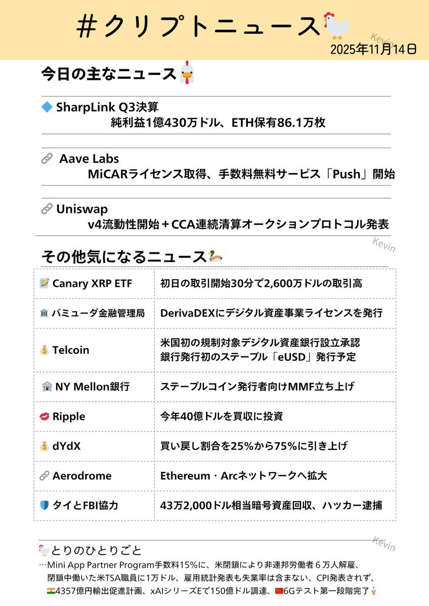 おはようございます。 11/ 14、クリプトニュースのお時間です🐔 クリプタクト課金するか悩みます。 誰かのお役に立ちましたら幸いです🍀 #ビットコイン #BTC #暗号資産 #暗号通貨 #仮想通貨 #クリプトニュース #イーサリアム #ETH #ステーブルコイン #JPYC pic.x.com/AFBVVfB8wP