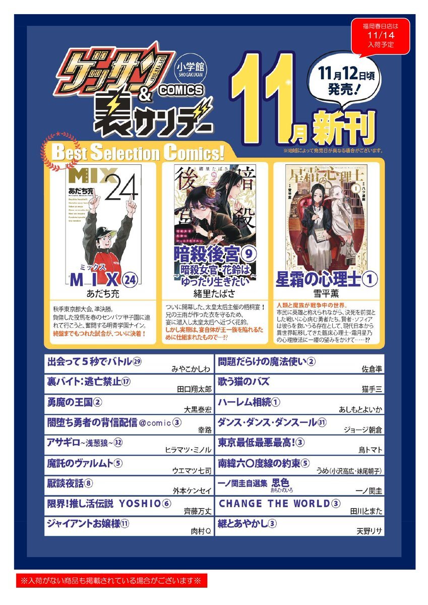 📕コミック新刊情報📕 11/12発売の #小学館 ゲッサン&裏サンデーコミックスの福岡入荷日は11/14です😊 #MIX(24) #暗殺後宮(9) など入荷予定 #フタバ図書TSUTAYAGIGA福岡春日店 pic.x.com/JTG8Xi6AOk