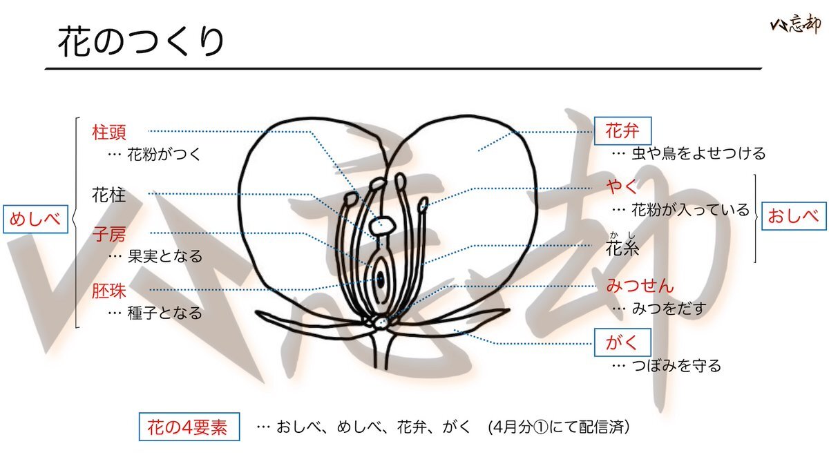 <植物④>花のつくり から1問 花の4要素を選びなさい。 <選択肢> ①花びら おしべ めしべ がく ②花びら がく みつせん 子房 ③おしべ めしべ がく みつせん ④花びら おしべ おしべ やく ▼解答 解説▼ 15:30頃配信中 解説画像は昨日の問題だよ😊 #中受 #暗記 #理科 pic.x.com/3Rf2q7TBgc