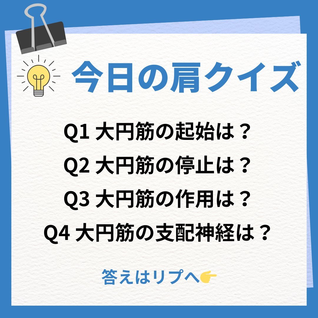 #今日の肩クイズ|大円筋 Q1 大円筋の起始は? → Q2 大円筋の停止は? → Q3 大円筋の作用を2つ以上 → Q4 腱板(Rotator cuff)に大円筋は含まれる?(○×) → Q5 支配神経は?(A. 肩甲上神経/B. 肩甲下神経/C. 腋窩神経) → 答えはリプへ👉 #暗記法 #解剖学 # #大円筋 pic.x.com/gvyIbn83Lf
