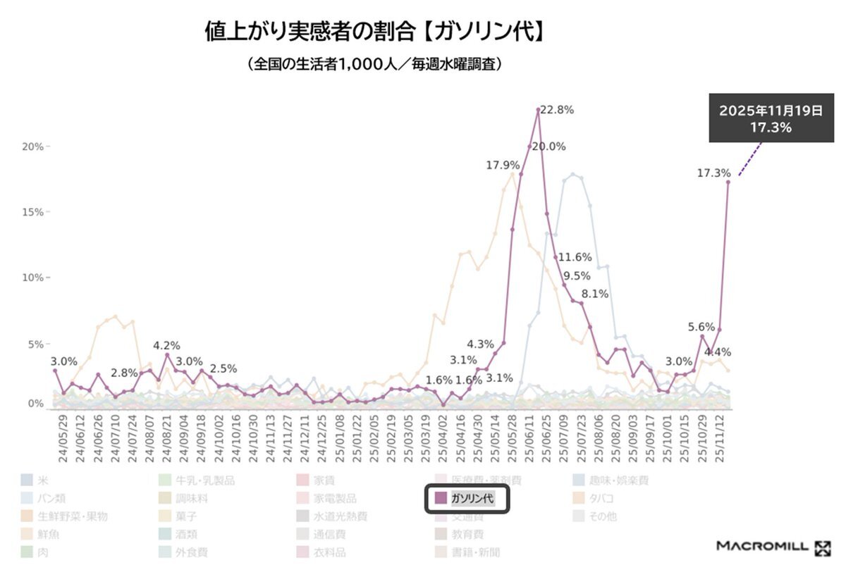 [今週のトピック] ガソリンの #暫定税率廃止 に向けた移行措置が開始し、値下がりを実感する人の割合が前週から11.2ポイント急増。 値下がり品目 ガソリン代 17.3%(前週+11.2ポイント) 最新調査:2025年11月19日~20日 #マクロミル 調べ pic.x.com/0ZDVtlbVyV