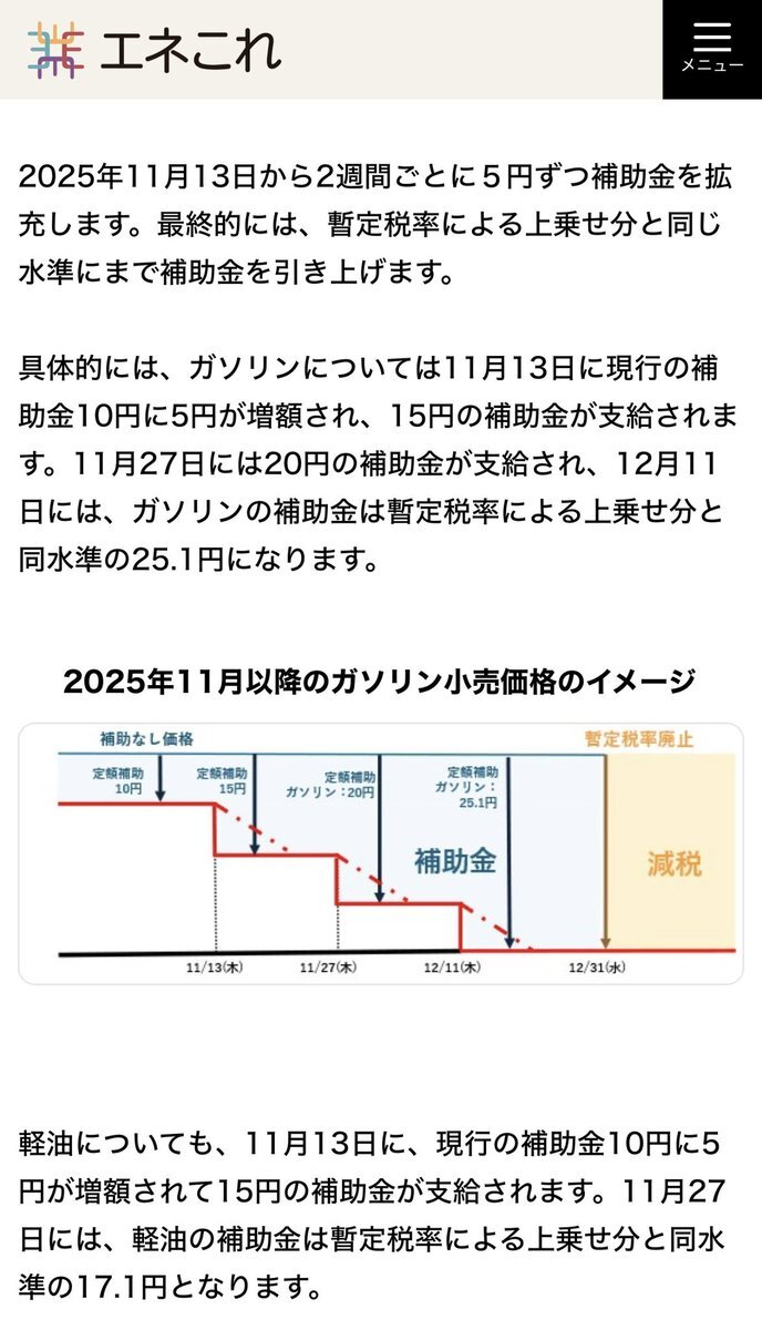 <11月中旬~ガソリン・軽油への補助金を拡充します> ガソリン・軽油の価格は、旧暫定税率廃止に向けて、順次値下がりしていきます。 廃止日に値下がりしませんので、いつものペースで普段通りの給油をお願いします。 👇詳細はこちら nenryo-teigakuhikisage.go.jp #ガソリン #軽油 #暫定税率