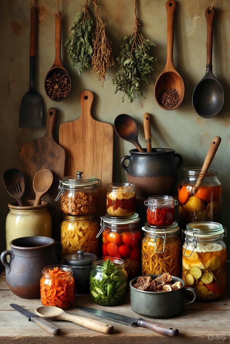 🍁🥢 秋の台所道具 実りをつなぐ道具たち。 収穫の秋──台所は、保存の季節。 干して、漬けて、埋めて、熟れを見守る。 木と土と布の力で、実りを冬へとつなぐ。 昔の道具には、四季を渡る知恵が息づいていた。 #昔の台所 #暮らしの知恵 #いにしえの道具 pic.x.com/vUzUimkVdv