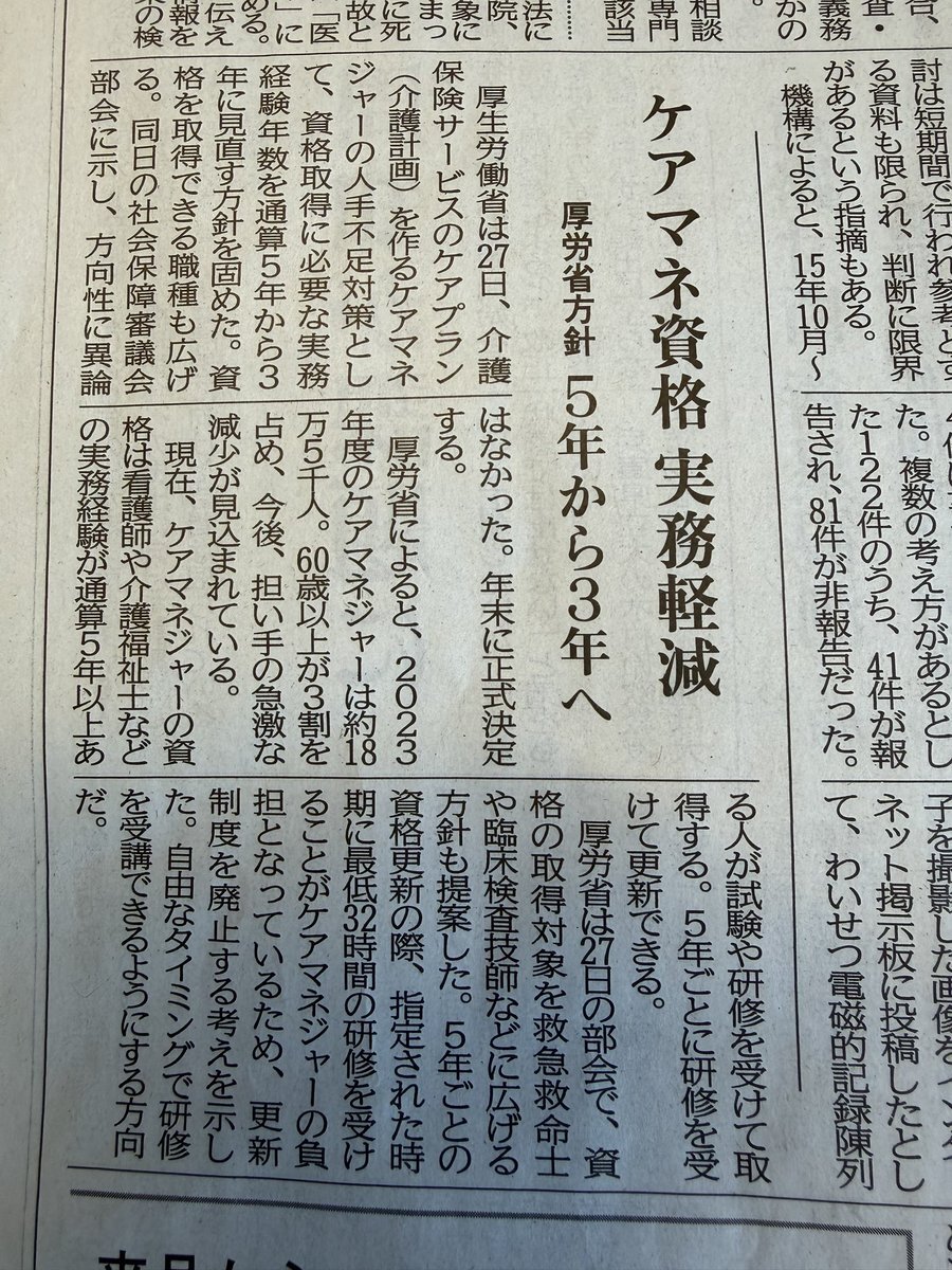 知り合いの人が送ってきてくれました。 昨日からケアマネが大きく、ざわついています。 事業所でも話し合い、辞めようとしてるケアマネを引き止めに入ってます。 受験資格の緩和に関しては、3年じゃなくて5年で良いんじゃないかな?とうちの事業所ではまとまってます。 #更新研修廃止 pic.x.com/8kHqNP5FYs