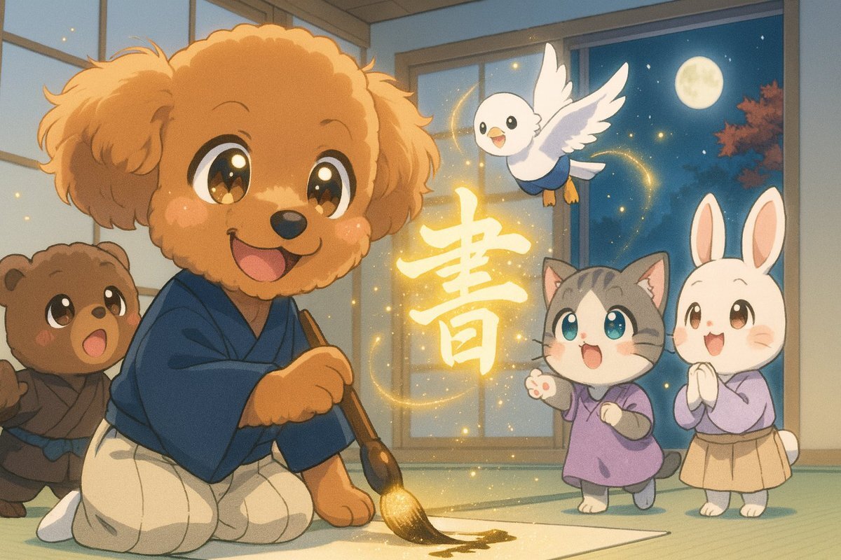本日のワンショット🐶 🐾ほのぼのシリーズ🐾 てんちゃんの筆が光ると…「書」が宙に✨ みんなで見守るやさしい秋の夜🍁 言葉が輝くってすてきだね🖌️💫 でちゅ~~~🐶✨💕💕💕 #愛犬 #トイプー #AIイラスト #書道の日・習字の日 pic.x.com/kKFuhEtDXT