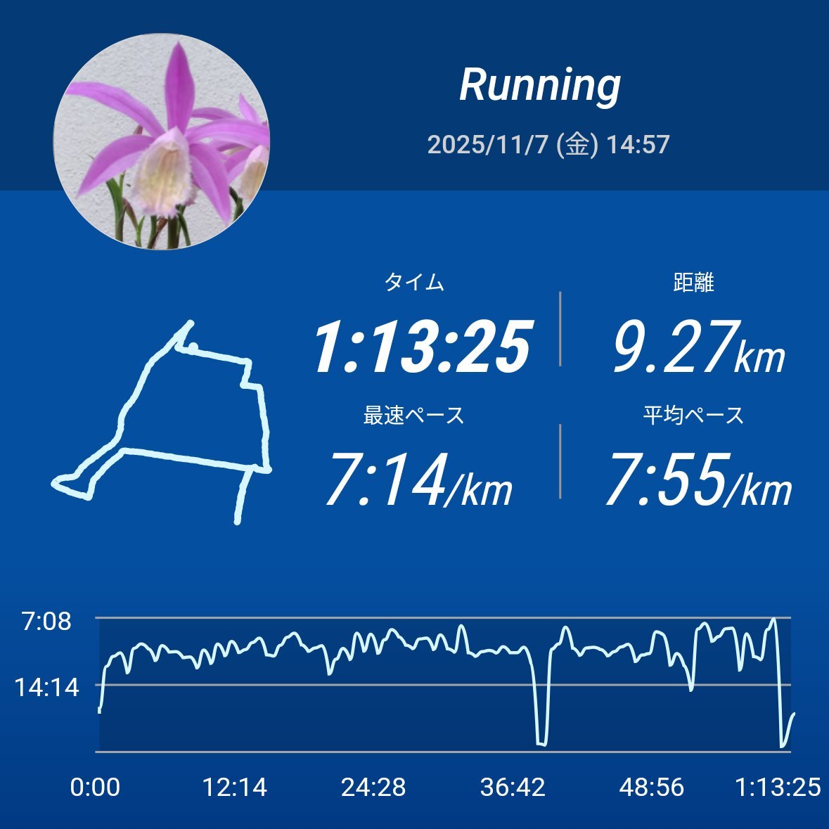 2025/11/7 (金) 14:57のアクティビティ 晴🌤️曇🌥️14℃ 風強 風が強くて寒い🌬️😰9キロラン🏃💦今日も平均ペースやっと8分弱🥵しょうがない #TATTA #山形まるごとマラソン #寒河江さくらんぼマラソン #最上川S_mileマラソン #日本一走るアナウンサー pic.x.com/KlVSsAnRBU