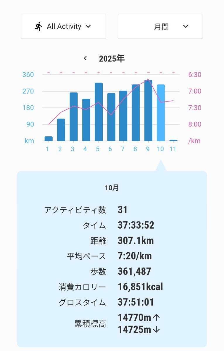 10月のアクティブティ😟TATTA練習履歴が9/15~10/12で9/20を除いて欠損していてランとウォーキングが分からず選択もall以外出来なくなった🤔アクティブティ数と距離は出ている🤔どうして? #TATTA #山形まるごとマラソン #寒河江さくらんぼマラソン #最上川S_mileマラソン pic.x.com/fGU2qTAjEy