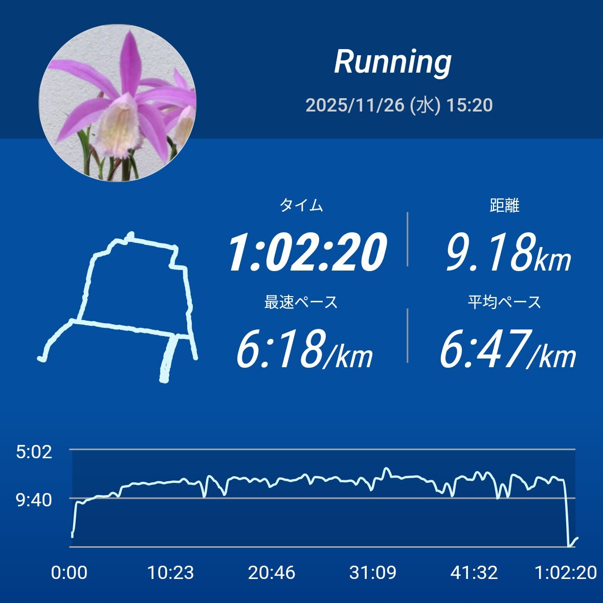 2025/11/19 (水) 14:38のアクティビティ 曇☁️ 6℃ 微風 雨模様の天気の合間9キロラン🏃💦思ったより寒くはなかった😅 #TATTA #山形まるごとマラソン #寒河江さくらんぼマラソン #最上川S_mileマラソン #日本一走るアナウンサー pic.x.com/hoaDAtTauS