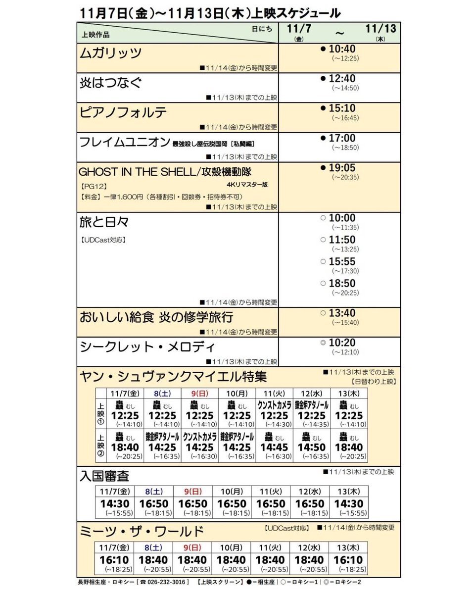 11/7(金)~11/13(木)の上映作品&上映時間 #旅と日々 🆕 #ムガリッツ 🆕 #ヤン・シュヴァンクマイエル 特集🆕 ※日替わり上映 (『#蟲』『 #錬金炉アタノール』『 #クンストカメラ』 ) #炎はつなぐ #フレイムユニオン #最強殺し屋伝説国岡 [私闘編] #入国審査 #シークレット・メロディ pic.x.com/feyIgnrM1Z