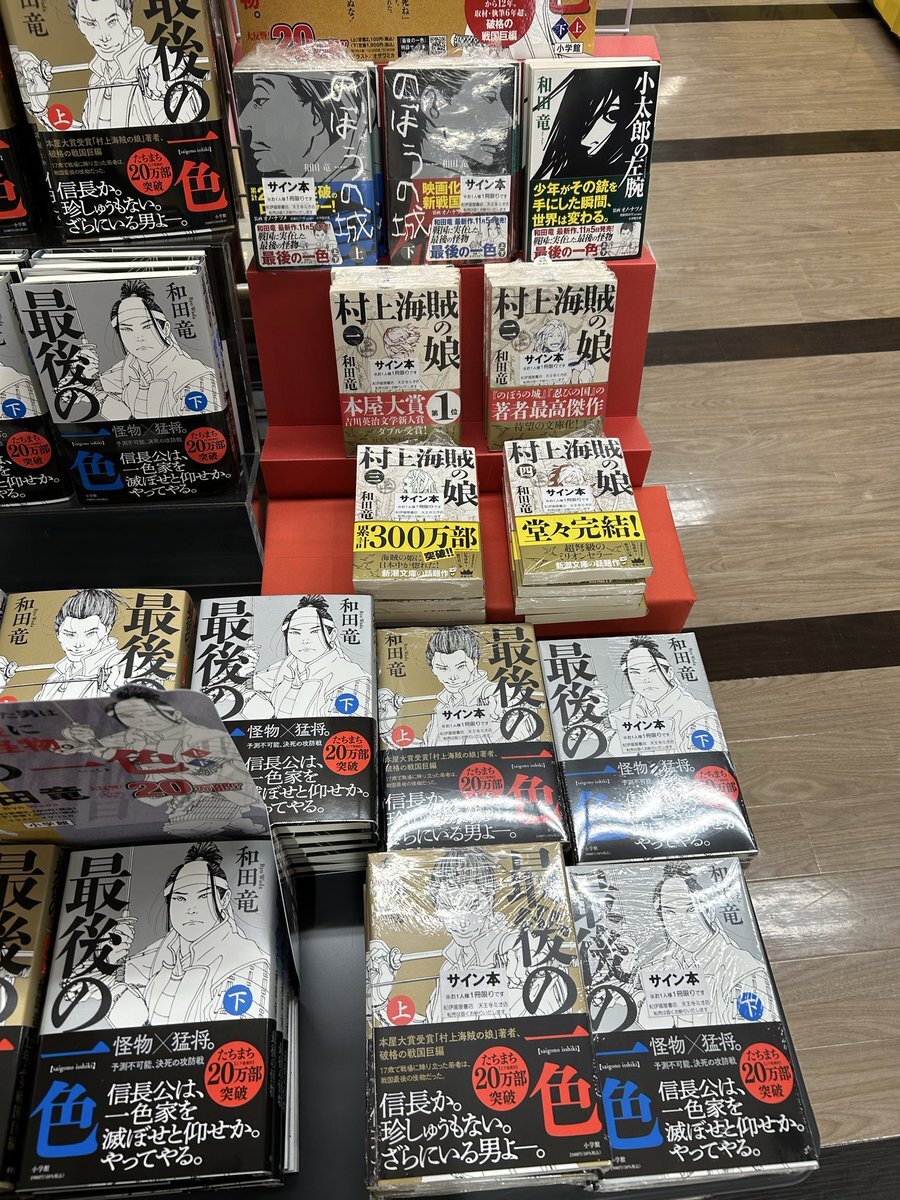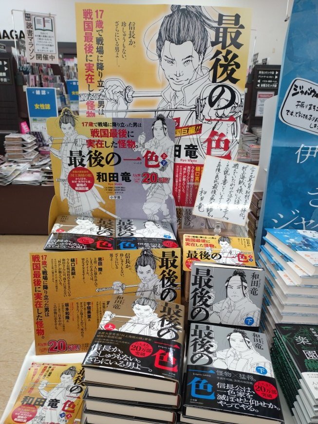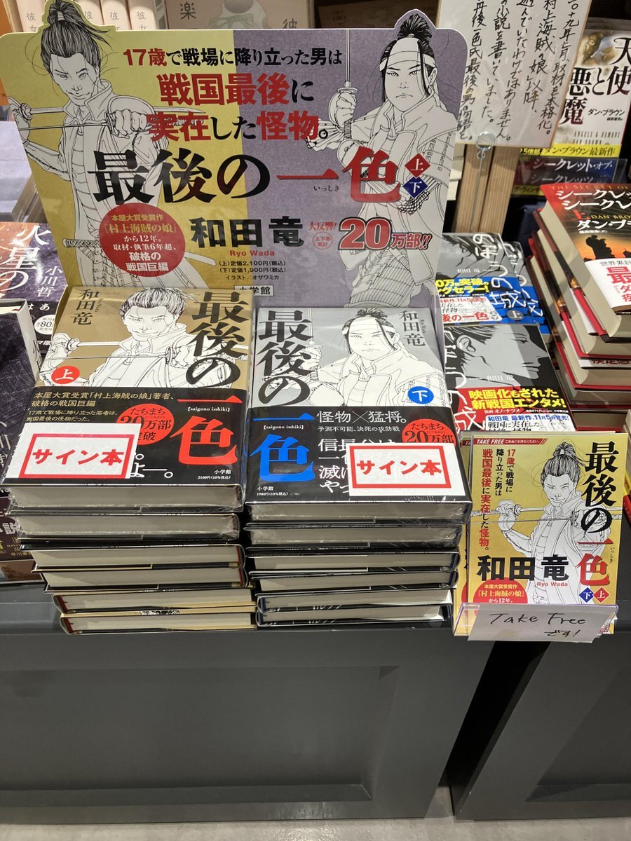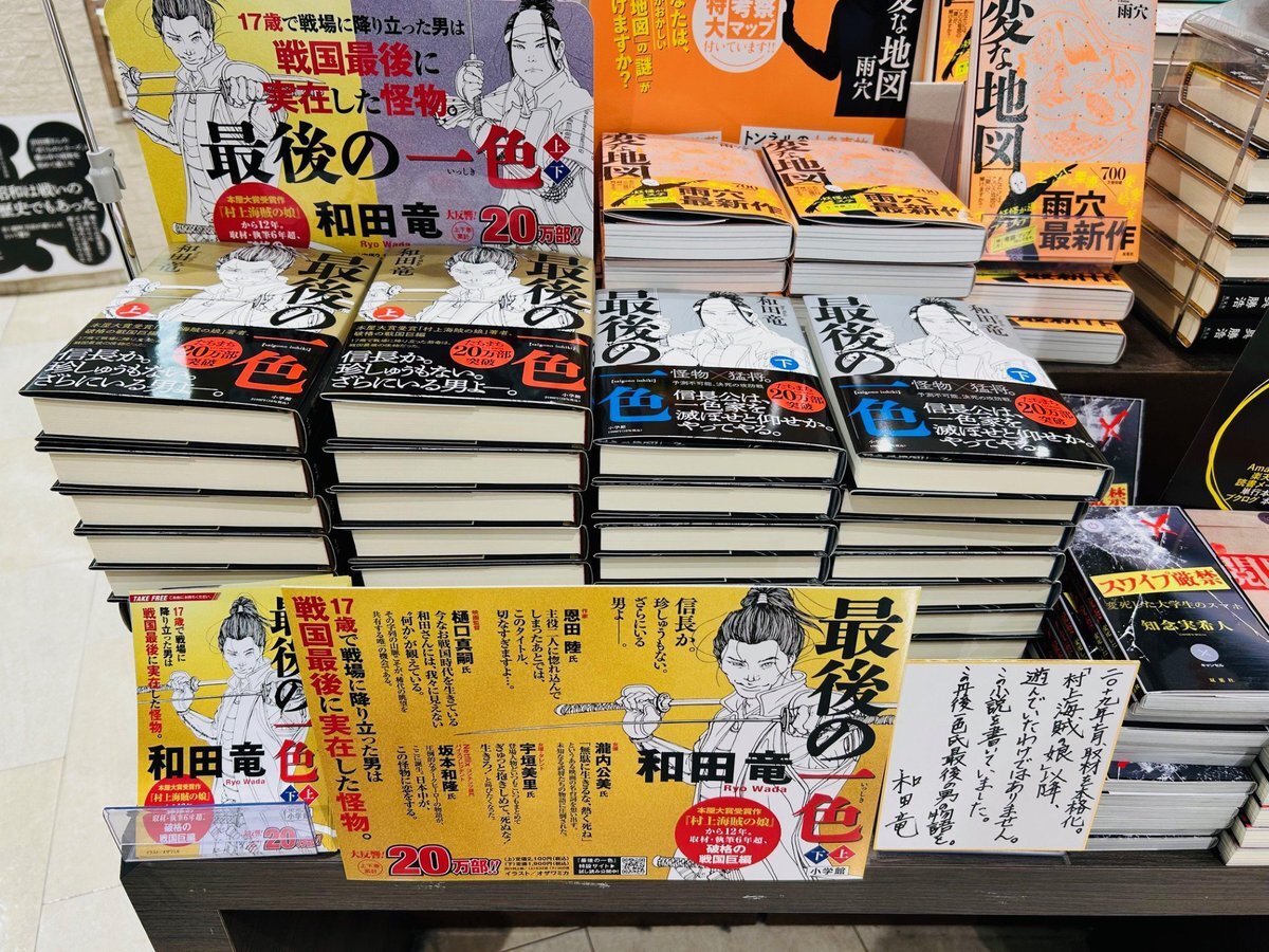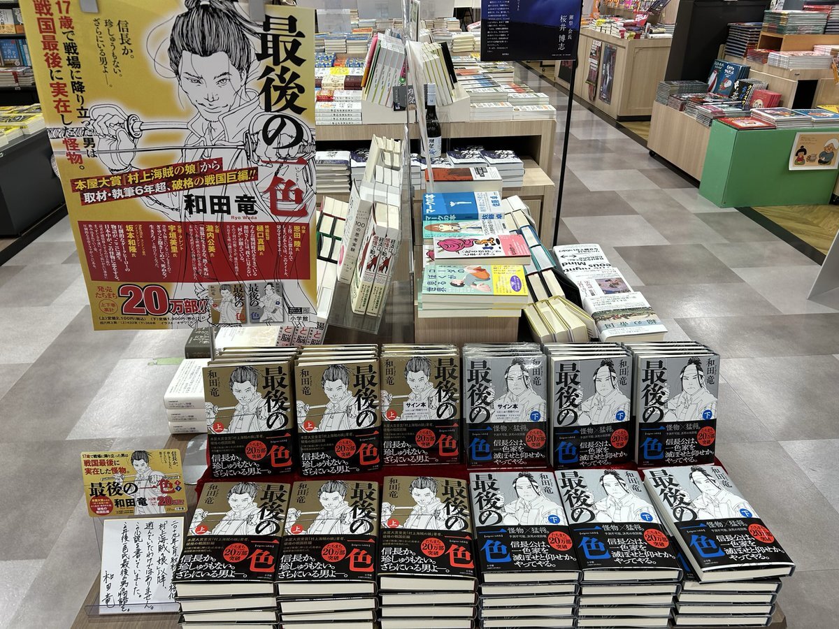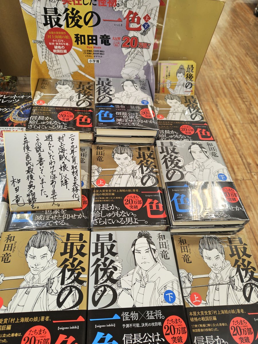 本日、和田竜先生ご来店くださいましたー🎉 最新刊『最後の一色(上、下)』と、その他既刊本のサイン本を作っていただきましたー👏 店頭在庫無くなり次第終了です!ゲットしたい方はお早めのご来店お待ちしております💨 #和田竜  #最後の一色 pic.x.com/Aj1bgFD0Ga
