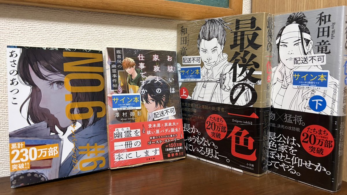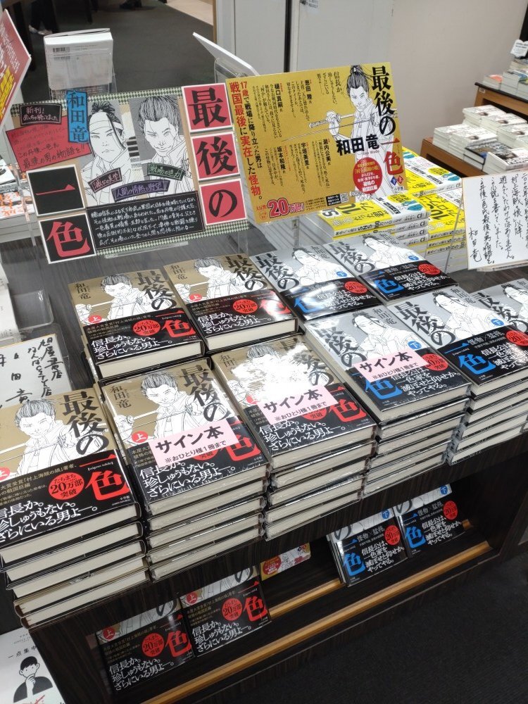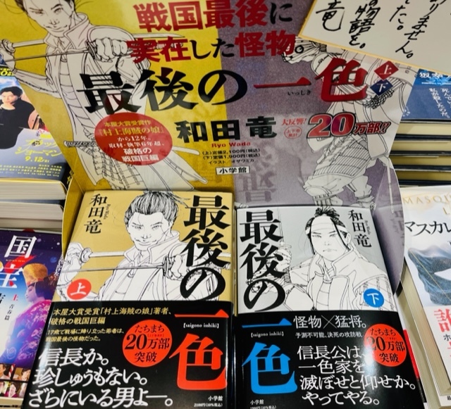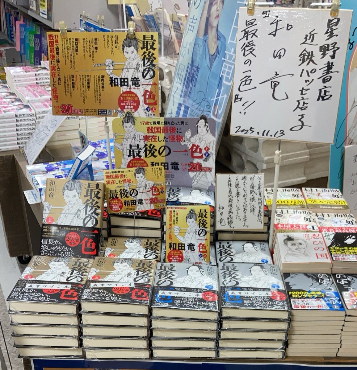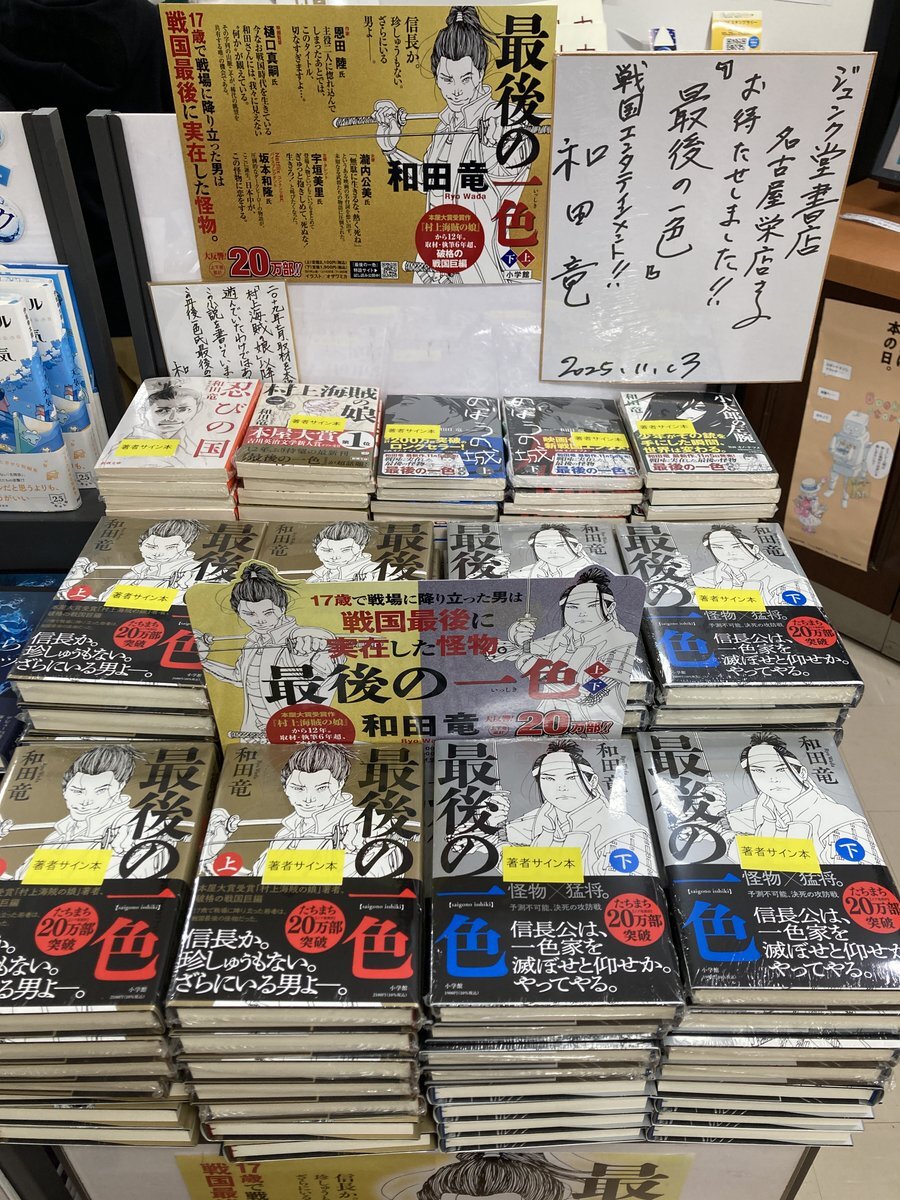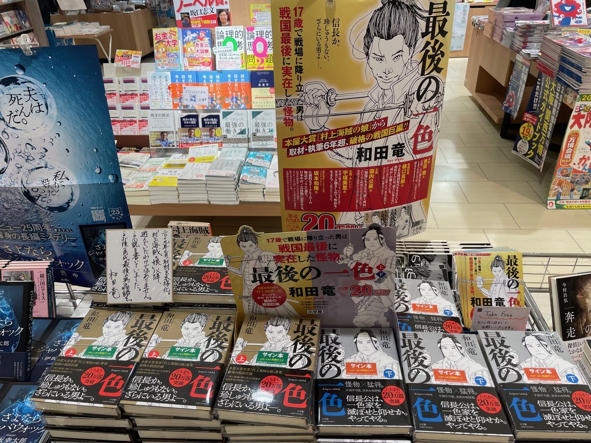 本日、和田竜先生ご来店くださいましたー🎉 最新刊『最後の一色(上、下)』と、その他既刊本のサイン本を作っていただきましたー👏 店頭在庫無くなり次第終了です!ゲットしたい方はお早めのご来店お待ちしております💨 #和田竜  #最後の一色 pic.x.com/Aj1bgFD0Ga