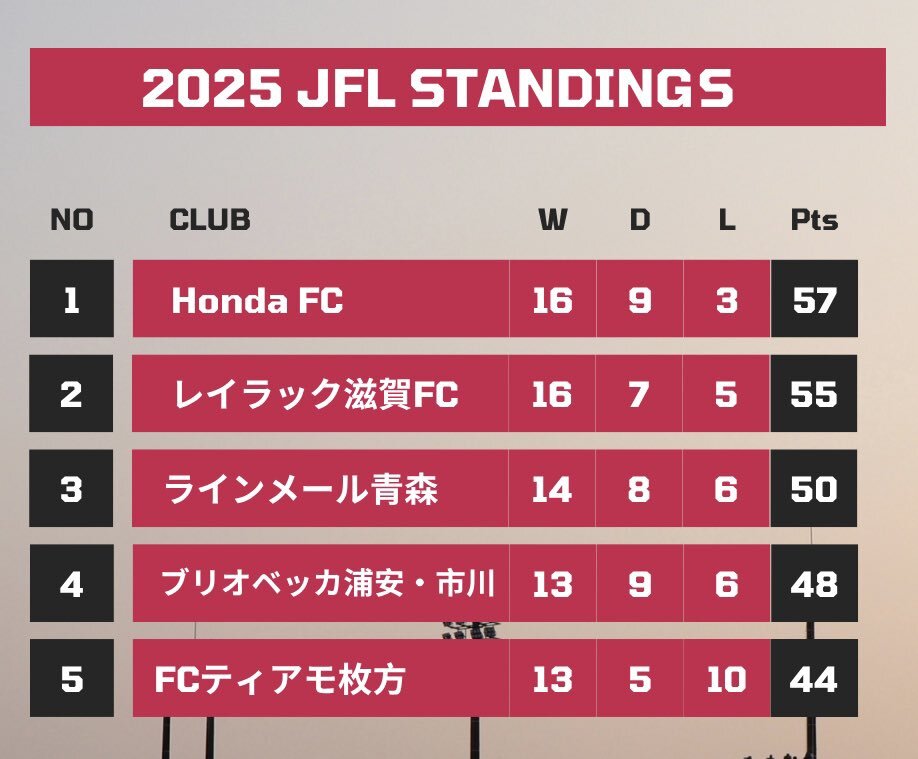 第28節を終えてのJFLTOP5順位表 今節で単独首位。 優勝まであと2勝。 #HondaFC