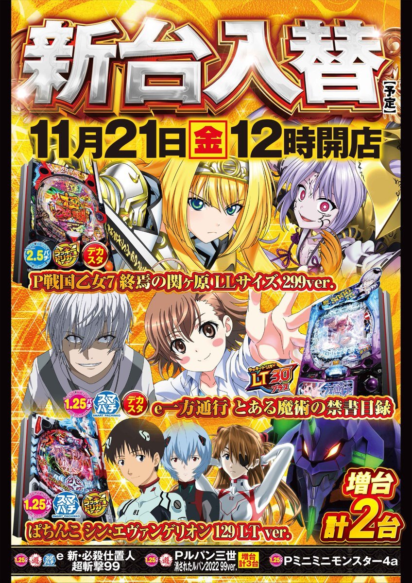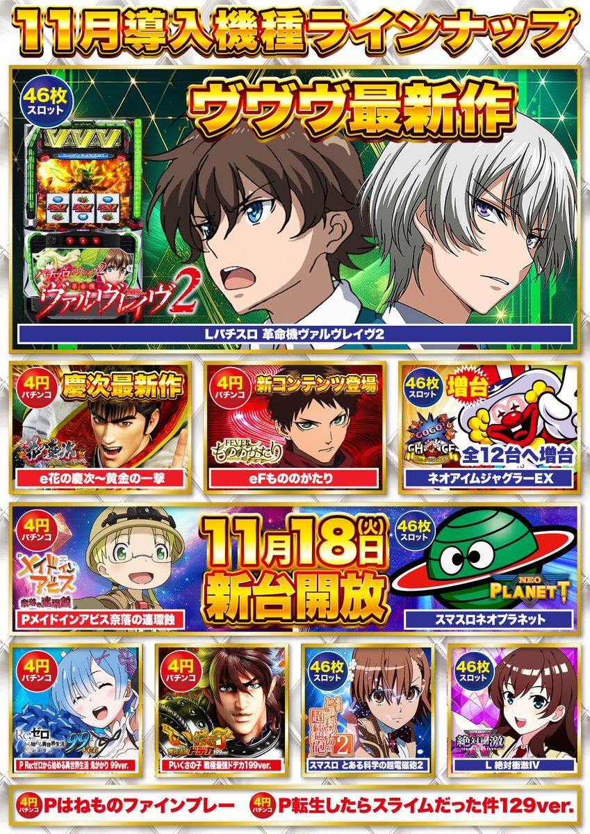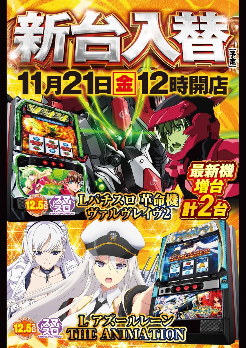 こんばんはウリンです😁 明日11/21(金)は昼12時開店🌈※抽選入場あり 【新台入替】 #Lヴァルヴレイヴ2 最新機増台 #Lアズールレーン #P戦国乙女 など最新機種~人気機種まで導入予定✨ #ミカド なら最新機種が低玉で打てる ご来店お待ちしてます🎶 #津島 #最新機種 #パチンコ #スロット実機 pic.x.com/os9uLGtzXZ