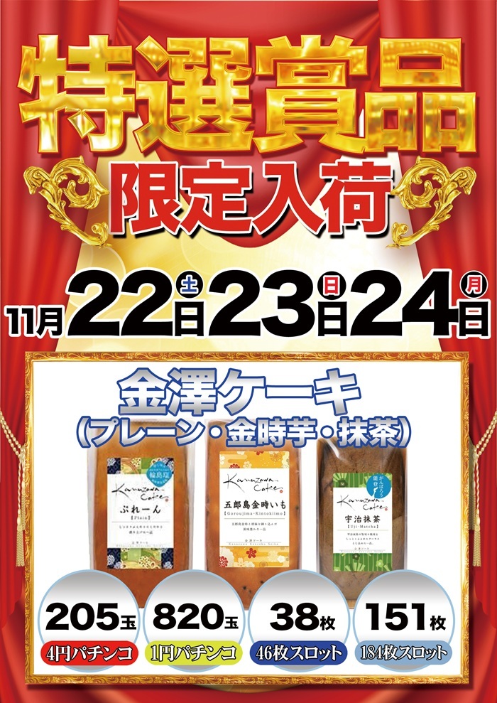 11月22日 10時オープン‼️ 整理券配布は9:45から 役職者ブログ更新🌌 ameblo.jp/maruhan-hosaka/ 💥最新台導入済 ※後日稼動機種もございます。 特選賞品入荷🍰 『金澤ケーキ』 ※数に限りがございます。 ご来店お待ちしております🙇 #マルハン #東大阪 #最新機種 pic.x.com/JiNfnfyTAr