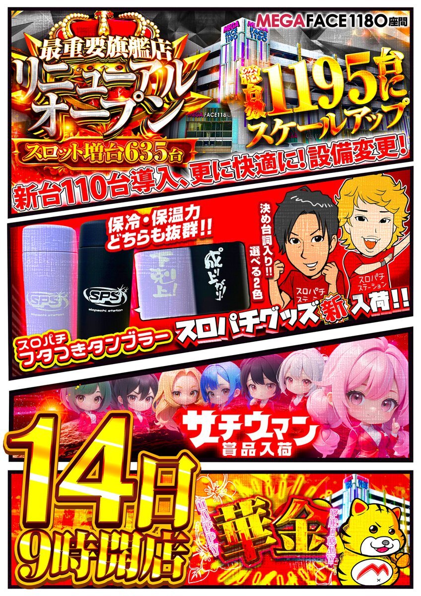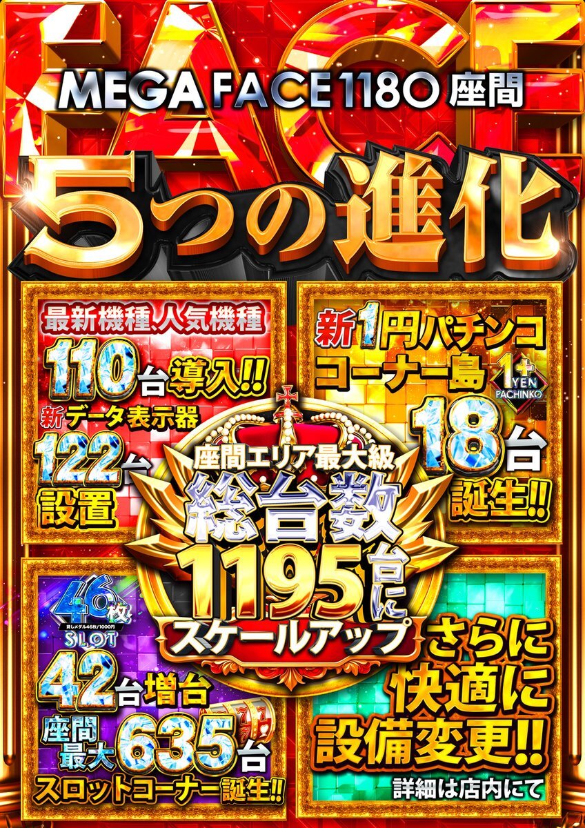 #メガフェイス座間の日常 お客様のもっと楽しいを目指して❗ ⚠️⚠️⚠️#最重要旗艦店⚠️⚠️⚠️ ①①月⑤日にリニューアルオープン🐯🔥 座間最大級‼️総台数1195台‼️ #スロット635台へスケールアップ🔥 メガフェイス①①⑧⓪座間が “5つの進化” 。 ぜひ❗❗❗ご覧ください🐯🔥 pic.x.com/UneYNBW9rf